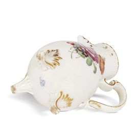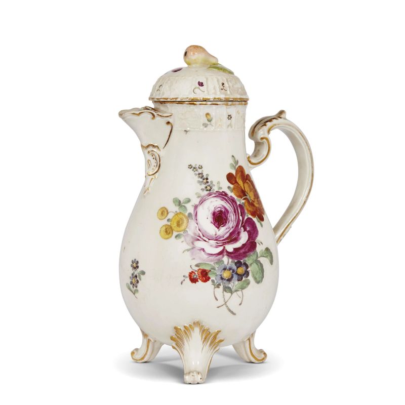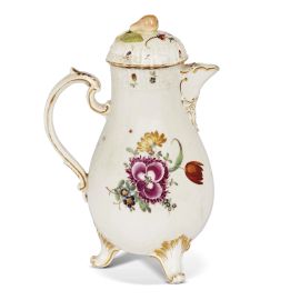 in porcellana dipinta in policromia e oro, corpo piriforme su piedi a rocaille, con manico a rocaille e coperchio a cupola con terminale a pera. La superficie è finemente dipinta con due grandi mazzi floreali centrati da una rosa porpora e da una viola. Questa caffettiera deriva da un modello di G.F. Riedel ed è prossima ad un esemplare probabilmente dipinto da F. Kirschner (inv. 28&A-1872) tra il 1765 e il 1770. La caffettiera reca sotto la base marca in blu cobalto. Etichetta di provenienza S. Giusti / U. Podestà – Milano all’interno del coperchio; alt. cm 21,8, diam, bocca cm 6,2