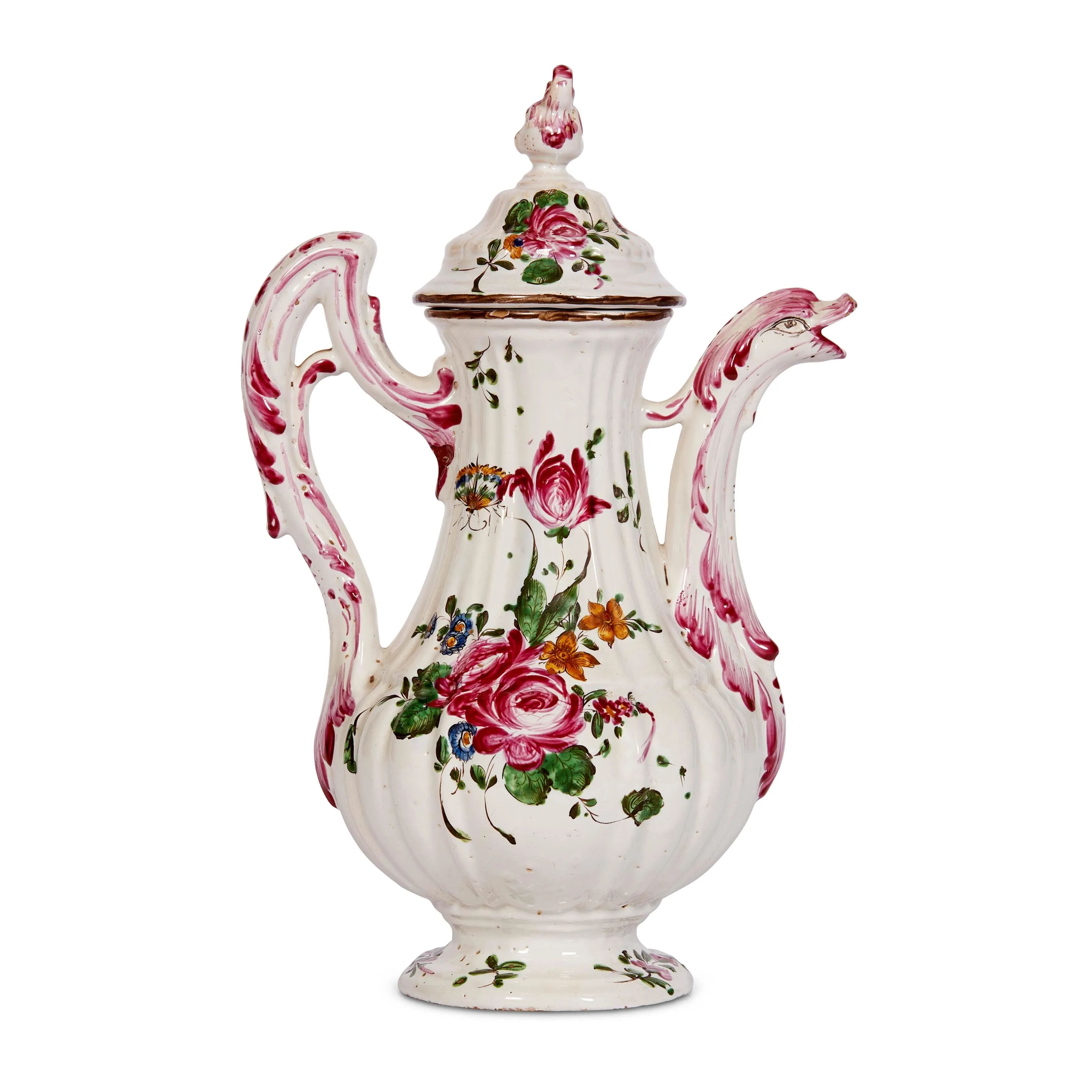 in maiolica dipinta in policromia, corpo piriforme baccellato con alto collo cilindrico e piede svasato, manico alto e sagomato, versatoio zoomorfo; coperchio costolato con presa a fiamma. La superficie è dipinta a terzo fuoco con un bouquet di fiori attorno a un insieme principale di rose, mentre piccoli fiori porpora ornano il piede; profili e orli sottolineati in porpora; alt. cm 28,5, diam. base cm 9