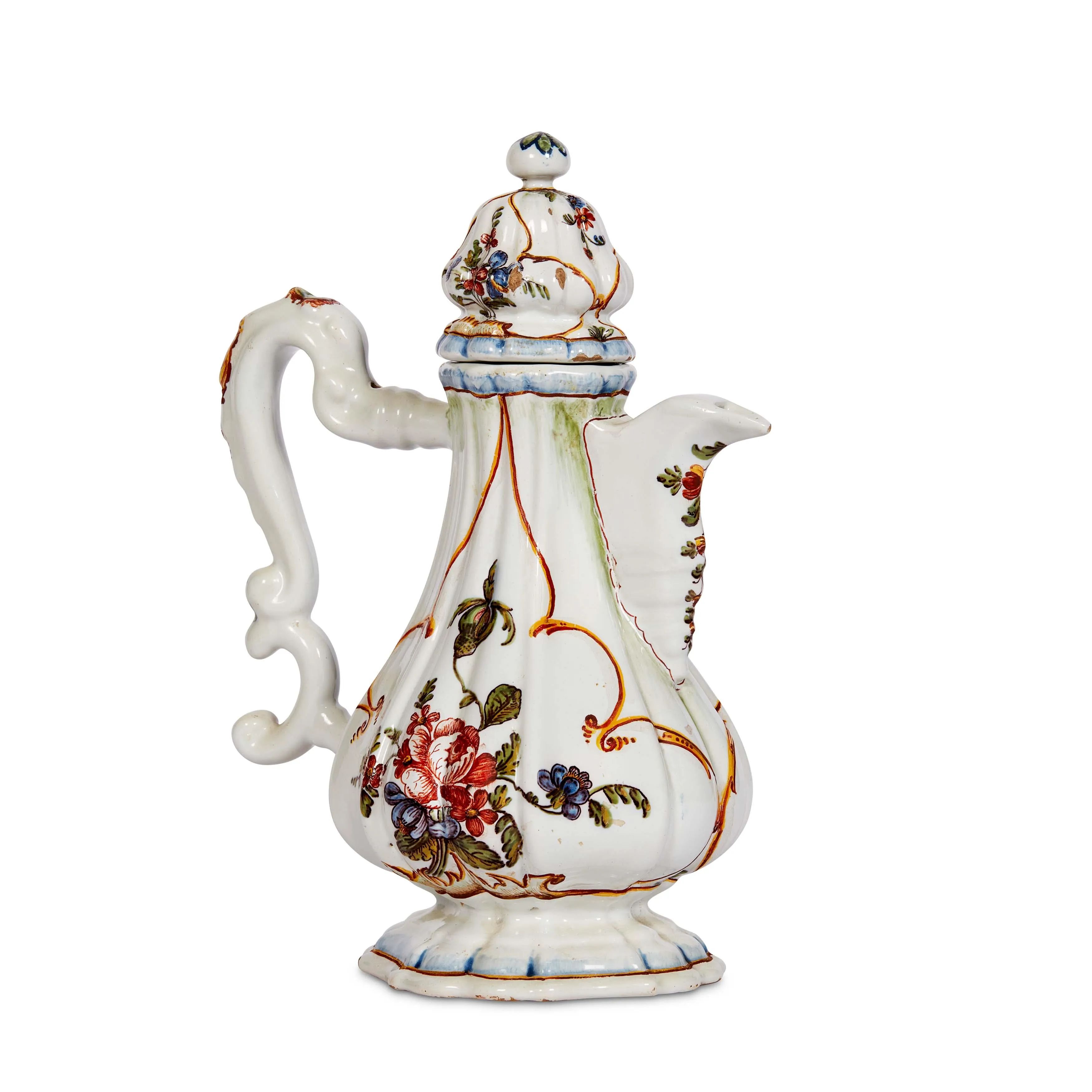 dipinta in policroma, corpo piriforme baccellato con versatoio sagomato di forma triangolare, presa a doppia voluta e coperchio “alla persiana”. Il corpo è decorato da due grandi composizioni floreali disposte sulle due facce e racchiuse entro sottili cornici sagomate, tratteggiate in bicromia giallo-rosso. Analogo decoro, naturalmente in proporzioni ridotte, orna il tappo, mentre un festone vegetale si sviluppa sul profilo del versatoio e sulla presa; alt. cm 26,2, diam. piede cm 11,4