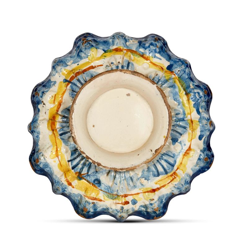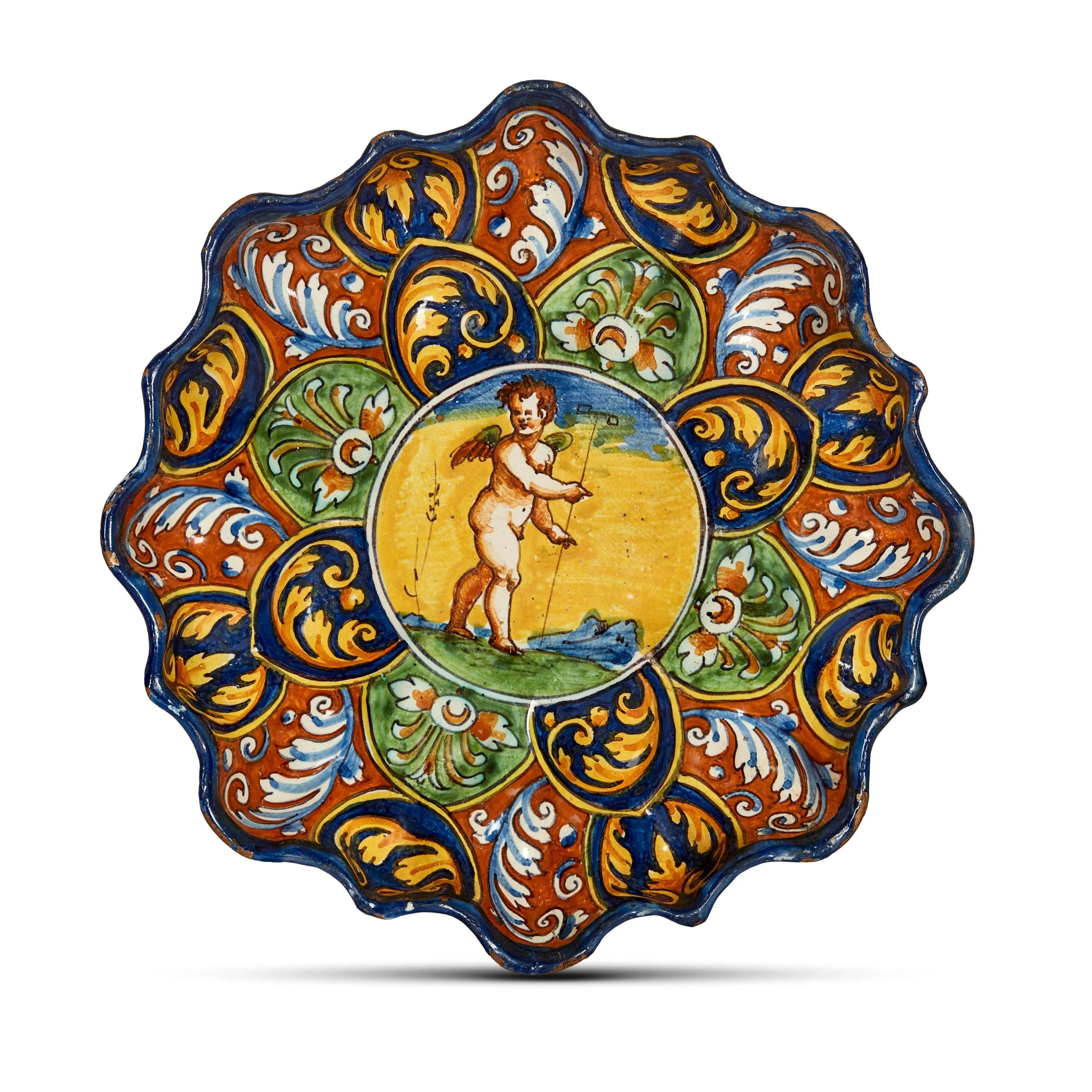 in maiolica dipinta in policromia, coppa con umbone centrale poco rilevato, orlo appena mosso e corpo sbalzato a formare sul retro una doppia fila di baccellature. Il decoro sul fronte mostra al centro un medaglione a fondo giallo con un putto alato in posizione stante e un accenno di paesaggio sullo sfondo, contornato da un ricco decoro a quartieri con riserve sagomate campite alternativamente in blu, verde e arancione contenenti ornati fogliati policromi. Al retro fasce policrome concentriche sulla parete, mentre il piede è dipinto in bianco; diam. cm 25, diam. piede cm 12,5, alt. cm 6,5