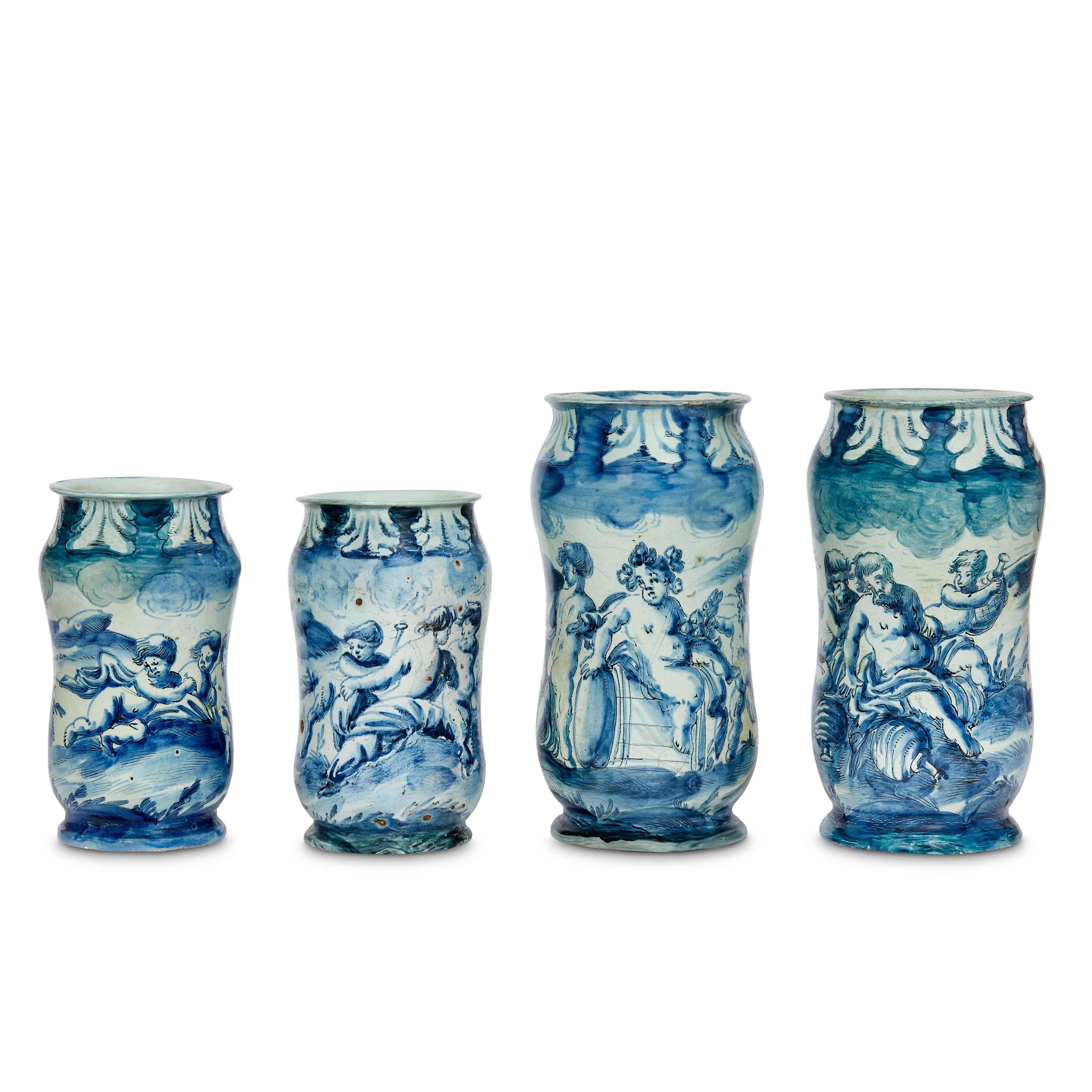 in maiolica dipinta in monocromia blu, corpo cilindrico appena rastremato al centro, collo rastremato con orlo estroflesso, piede a disco. L’intera superficie mostra una decorazione del tipo “istoriato barocco” con scene bacchiche sul fronte e paesaggi agresti con edifici sul retro, mentre il bordo superiore è caratterizzato da una serie continua di foglie di acanto aperte eseguite a risparmio. Questi albarelli, divisi in due coppie per le dimensioni, provengono da una farmacia spagnola di Figueras, della quale sei esemplari sono conservati nella collezione della Cassa di Risparmio di Savona, mentre altri furono esposti a Savona nel 1990 in occasione della dedicata alla Collezione Principe Arimberto Boncompagni Ludovisi. Marca stemma sotto il piede; alt. cm 27, diam. bocca cm 12,4, diam. piede cm 12,6 (2) e alt. cm 21, diam. bocca cm 11, diam. piede cm 10 (2)