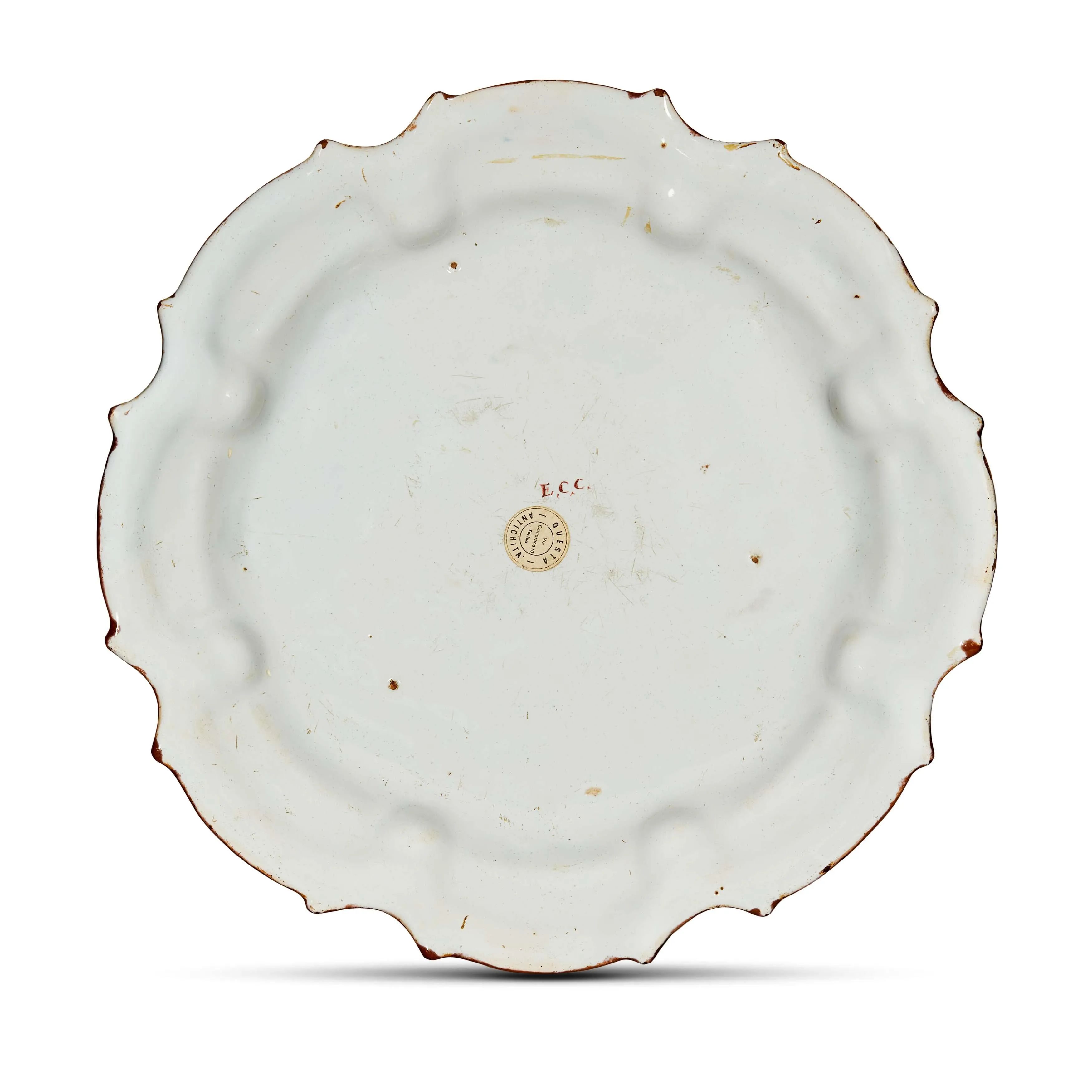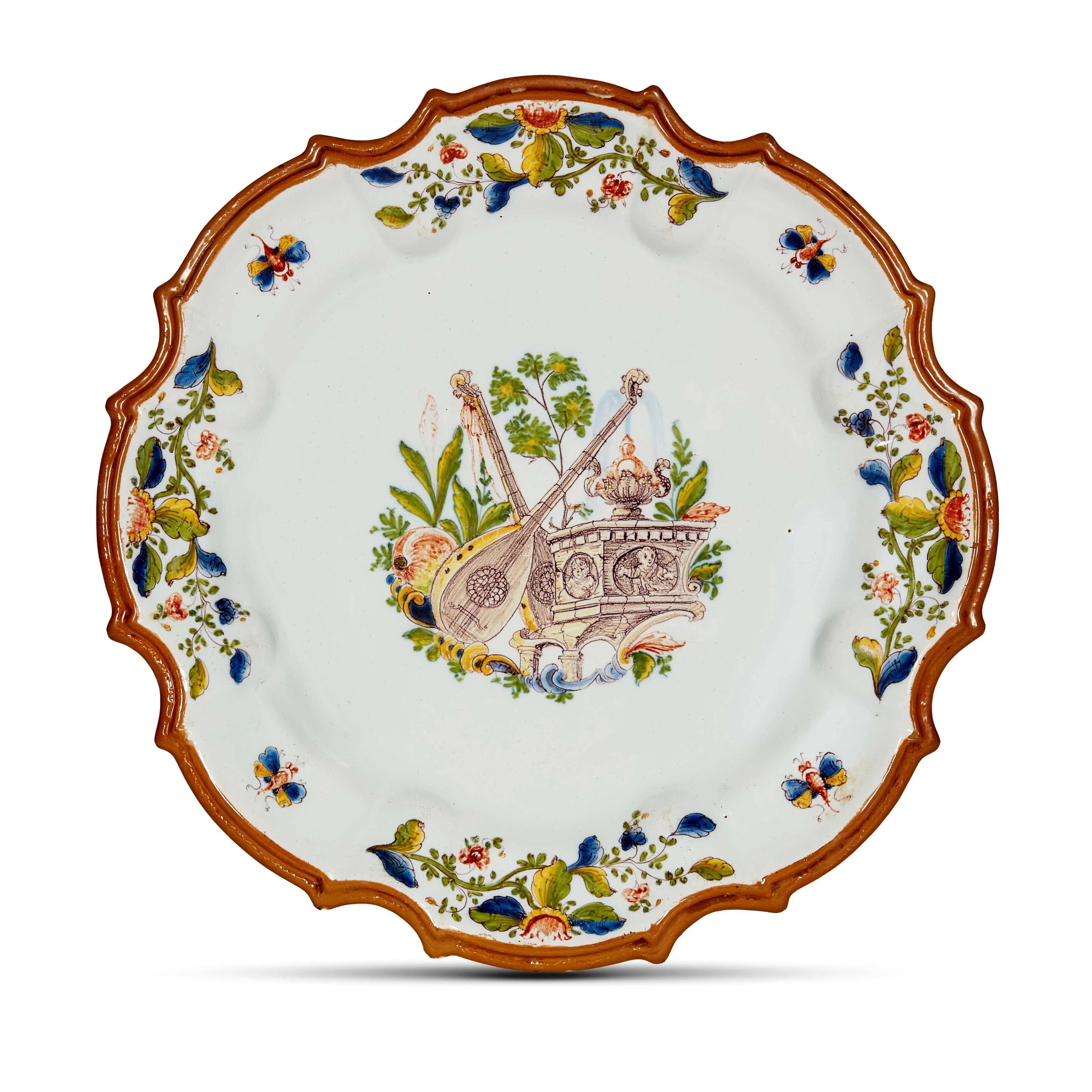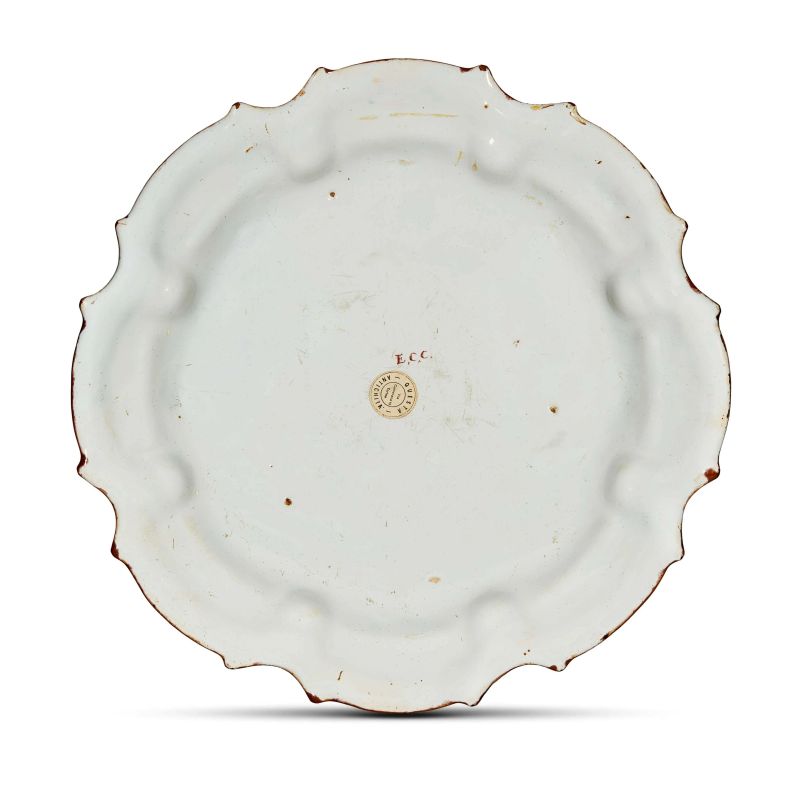 in maiolica dipinta in policroma a gran fuoco, di forma circolare con orlo mistilineo e tesa baccellata. La decorazione policroma, derivata dalla “frutta barocca”, mostra sulla tesa i consueti steli a foglie e fiori alternati a farfalle in volo, mentre nel cavetto la consueta frutta è sostituita da una raffinata veduta con due liuti, dietro i quali fa capolino un frutto, ma soprattutto dalla parte superiore di un tempietto ornato con medaglioni scolpiti e rilievo e sormontato da una fontana zampillante. Lo stile decorativo e la marca E.C.C. tracciata sul retro collegano il nostro piatto ad alcuni esemplari pubblicati in occasione della mostra sulla ceramica degli Antonibon del 1990, riguardo al cui autore Raffaella Ausenda scriveva: “Il pittore E.C.C. firma pezzi unici che, pur appartenendo a un certo assortimento, se ne distaccano per originalità, un tipo di prodotto speciale nella serie che caratterizza la fabbrica novese”. Al retro sigla E.C.C. in rosso ed etichetta di provenienza ANTICHITÀ QUESTA – Torino; diam. cm 34,2