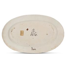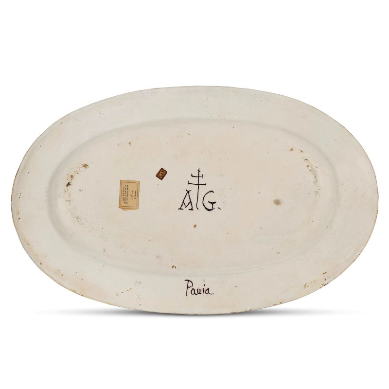 in maiolica dipinta in policromia di forma ovale, balza bassa e tesa orizzontale a orlo arrotondato e appena rilevato. Reca una fitta decorazione che vede protagonista al centro del cavetto una città turrita con un ponte a doppio fornice su un fiume, mentre la tesa mostra nei quattro punti cardinali da fronde arboree che si allagano a partire da una roccia arrotondata. L’opera, nota fin dall’importante mostra milanese del Poldi Pezzoli (1964), vanta numerose pubblicazioni poiché da sempre considerata esempio cardine delle produzioni pavesi del secolo XVIII. Tra queste pubblicazioni ricordiamo lo studio di Carmen Ravanelli Guidotti che ha comportato la definitiva attribuzione dei vasi della Farmacia di Novellara alle manifatture lombarde di Lodi: in esso il vassoio funge proprio da esempio principe della modalità decorativa cosiddetta “al castelletto”, che compare appunto nei vasi della farmacia sopracitati e che si diffuse trasversalmente dalla Liguria al Piemonte, dalla Lombardia alle Marche con criteri e movenze stilistiche differenti. Ecco dunque che l’opera si presenta come una delle poche testimonianze certe di questa modalità decorativa nella città di Pavia. Al verso compaiono le lettere A.G. centrate da una croce e l’iscrizione Pavia in manganese. Il grande vassoio reca inoltre l’etichetta della mostra del Museo Poldi Pezzoli con indicazione N. 1 Coll. R. Bozzano; cm 37x58