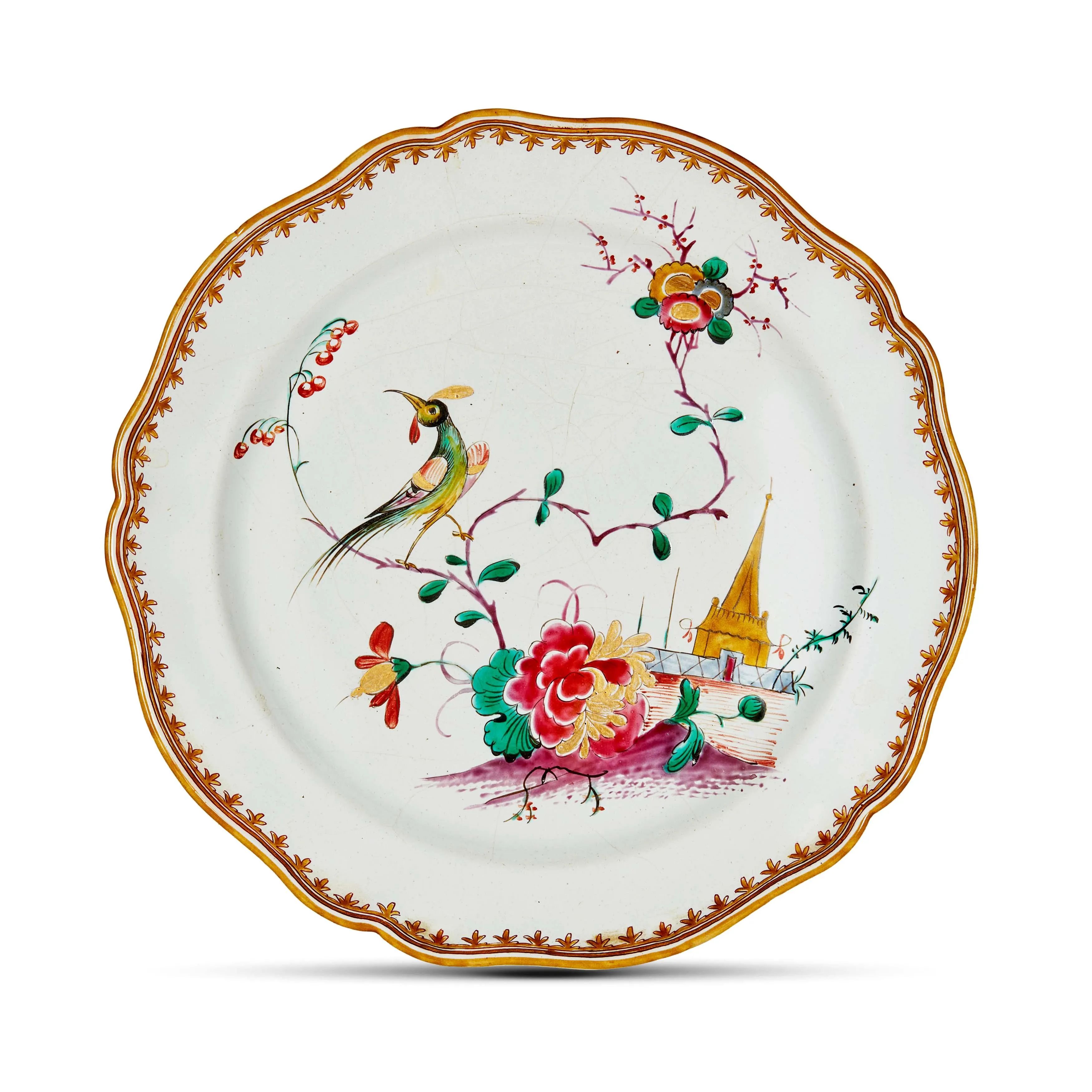 in maiolica decorata a piccolo fuoco in policromia con rosso, porpora, verde, giallo, bruno di manganese; bordo mosso leggermente rilevato, sottolineato da un motivo a “punta di lancia”, mentre il cavetto ospita un ornato a cineserie con un grande fiore di peonia nella parte inferiore, dal quale si alza un sottile alberello fiorito con un grande uccello appollaiato, e sulla destra una piccola pagoda. Si tratta di uno dei modelli più ricercati e rari della manifattura Finck a Bologna, che le carte d’inventario del 1796 descrivono “con oro e contorno giallo”; diam. cm 28