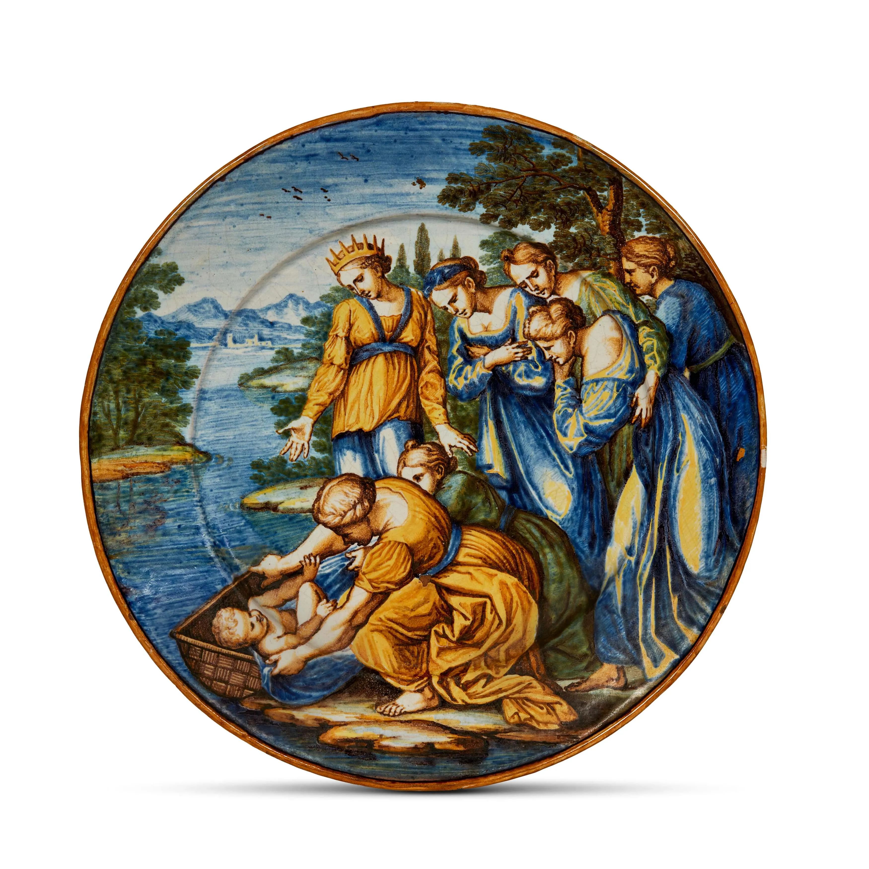 in maiolica in policroma a gran fuoco di forma circolare con cavetto piano, tesa orizzontale e bordo arrotondato. La decorazione, che interessa l’intera superficie del piatto, rappresenta l’episodio biblico di Mosè salvato dalle acque, secondo l’iconografia derivata dall’incisione di Cesare Fantetti realizzata per la serie Imagines Veteris Ac Novi Testamenti A Raphaele Sanctio Urbinate in Vaticani Palatii Xystis, pubblicata a Roma da Giovanni Giacomo De Rossi nel 1675. Iscritto sul retro in inchiostro bruno Pharaonis filia, Aperta fiscella, cernit paruulum Vagientem, Misertaq. Illius nomen eius Moyses; diam. cm 25,5, alt. cm 2,5
