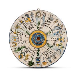 in terracotta invetriata in policromia, costituito da una placca circolare divisa in sezioni radiali che contengono immagini simboliche e segni zodiacali accompagnati da numeri romani. Si tratta di un esemplare in maiolica del “gioco della mea", passatempo di origini veneziane risalente all’incirca al 1775, costituito da una ruota della fortuna nella quale era fatta girare una freccia, probabilmente metallica, determinando gli eventi cui il giocatore sarebbe andato incontro. Un esemplare di confronto affine è stato pubblicato come esempio di roulette da Federico Marzinot; diam. cm 34,2