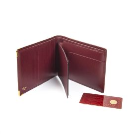 In pelle bordeaux con proteggi angoli in oro, classico portafloglio con 5 spazi c/c e portassegni estraibile.