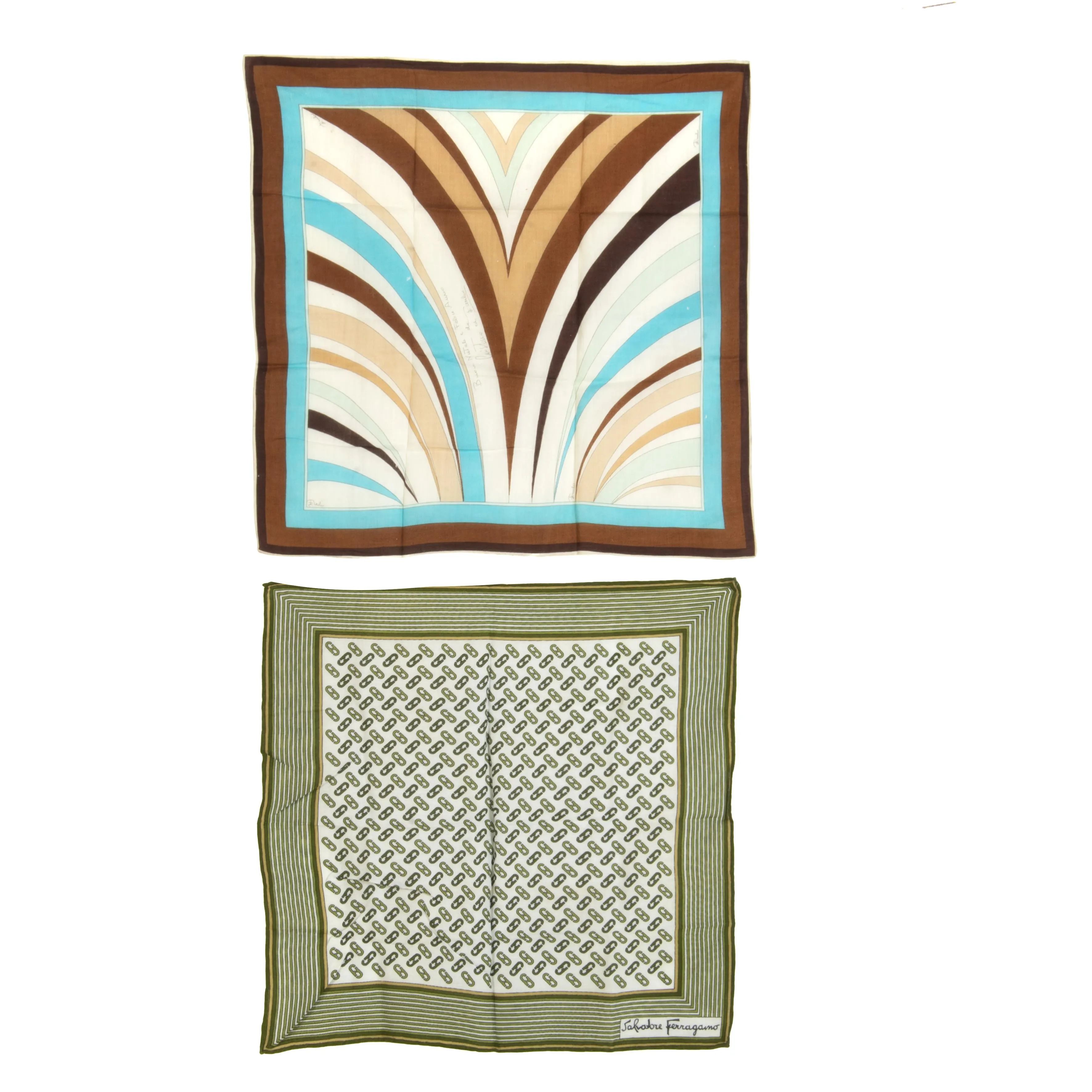 Uno di Salvatore Ferragamo e l'altro di Emilio Pucci, nei caldi colori dei verdi e dei marroni; perfetti per adornare il manico di una borsa.