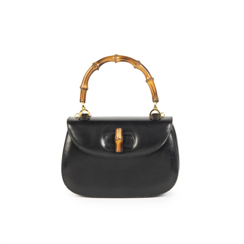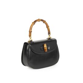 Con le sue caratteristiche uniche, come il manico in bamboo curvato a mano e la chiusura con nottolo sempre in bamboo, questa borsa incarna lo stile inconfondibile e l'eccellenza artigianale della Maison. Questa versione vintage in pelle liscia nera con metalleria in ottone e particolare fodera a contrasto rossa. Corredata di doppia tracolla staccabile: una nera e una rossa.