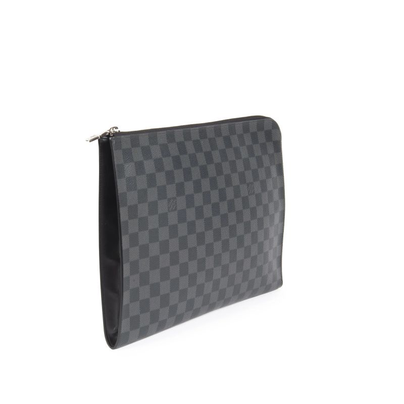Questa pochette è realizzata in tela Damier nera e grigia, con parti metalliche color argento. Questo versatile e accattivante modello, tra i più iconici della Maison, si distingue per il suo stile raffinato e unisex. L'ampia chiusura a L con zip ne permette un comodo utilizzo.