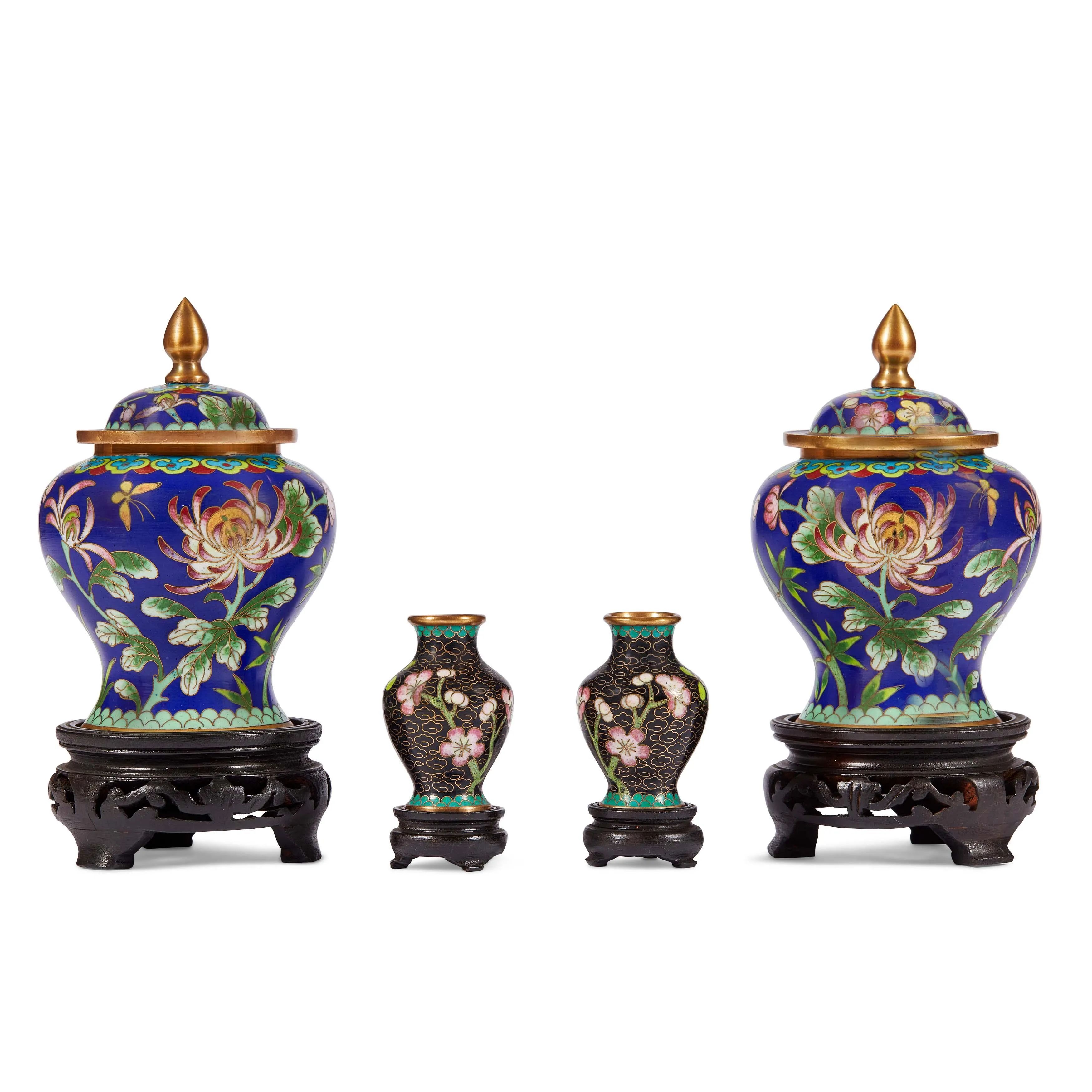 in smalto, i vasi più grandi a balaustro con coperchio con cimiero a bulbo, decorati con crisantemi e peonie su fondo blu, le miniature a vaso con fiori di pruno su fondo nero. Ciascuno con supporto in legno intagliato a traforo.