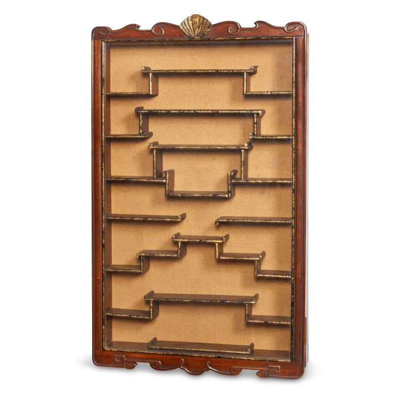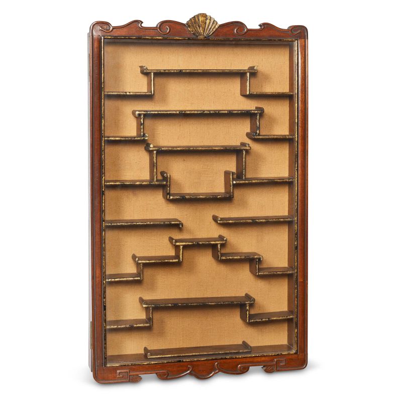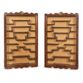 In legno, intagliate con motivi floreali e con bordi dorati. Sulla sommità, una conchiglia stilizzata in legno intagliato. Rivestite internamente in tessuto.