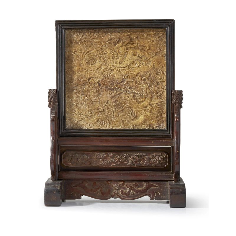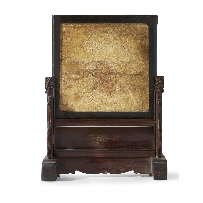 in pietra saponaria intagliata, pannello quadrato raffigurante draghi tra le nuvole, montato su una base in legno finemente intagliata con motivi floreali. Dim. cm 17.3 x 17.3; Alt. totale cm 31.5