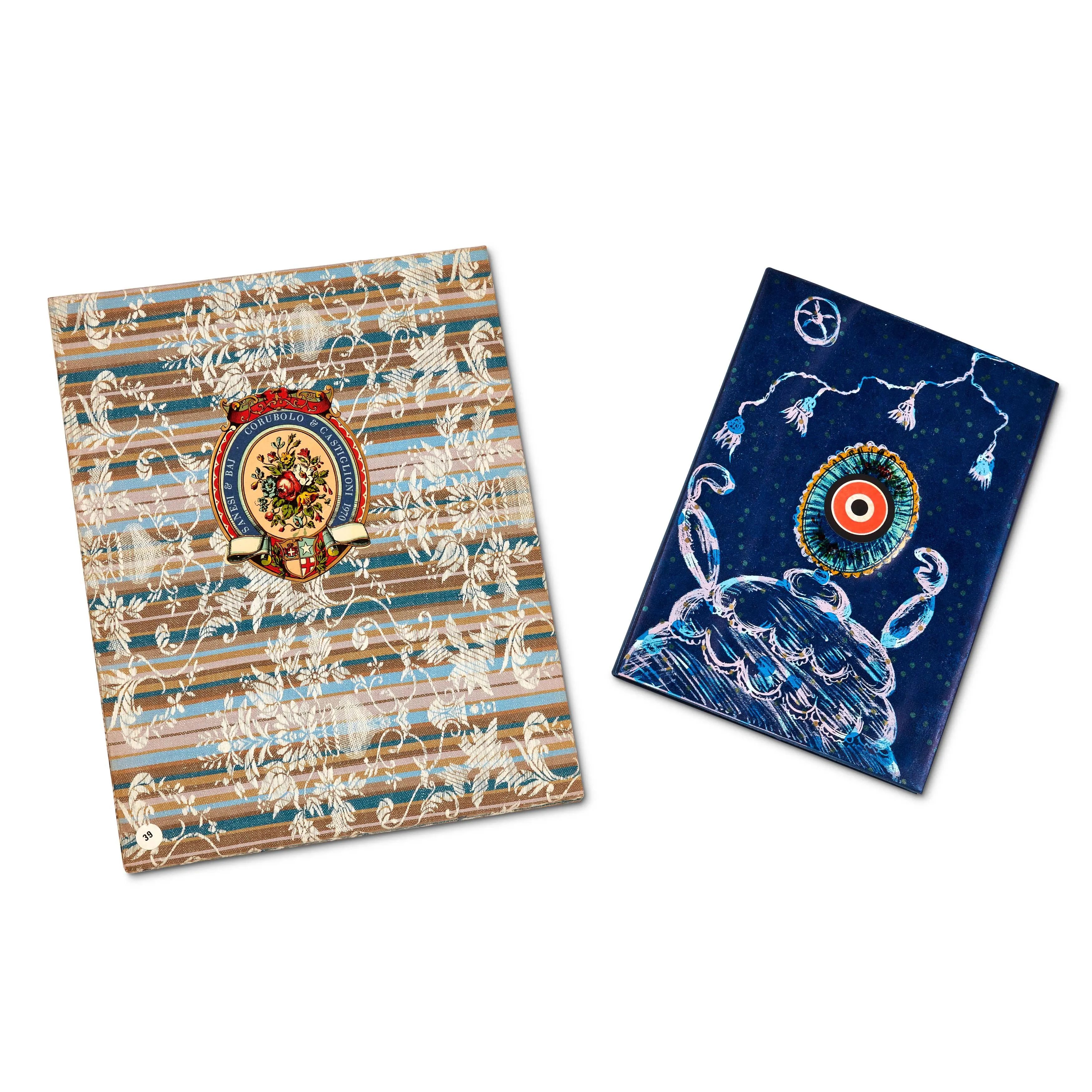 legatura in brossura alla francese con acetato entro cofanetto con struttura lignea e rivestimento in tessuto