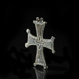 Particolare pendente configurato a croce dotato di anelli di sospensione. Le decorazioni, rese ad incisione, sono presenti su tutta la superficie anteriore del reperto e si presentano sotto forma di linea continua a cordicella che corre su tutti i bordi esterni, insieme alla rappresentazione di un'ulteriore croce visibile centralmente. Particolare la presenza di testo le cui lettere visibili sono "MAR --- AV". Forse realizzate successivamente.
