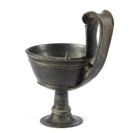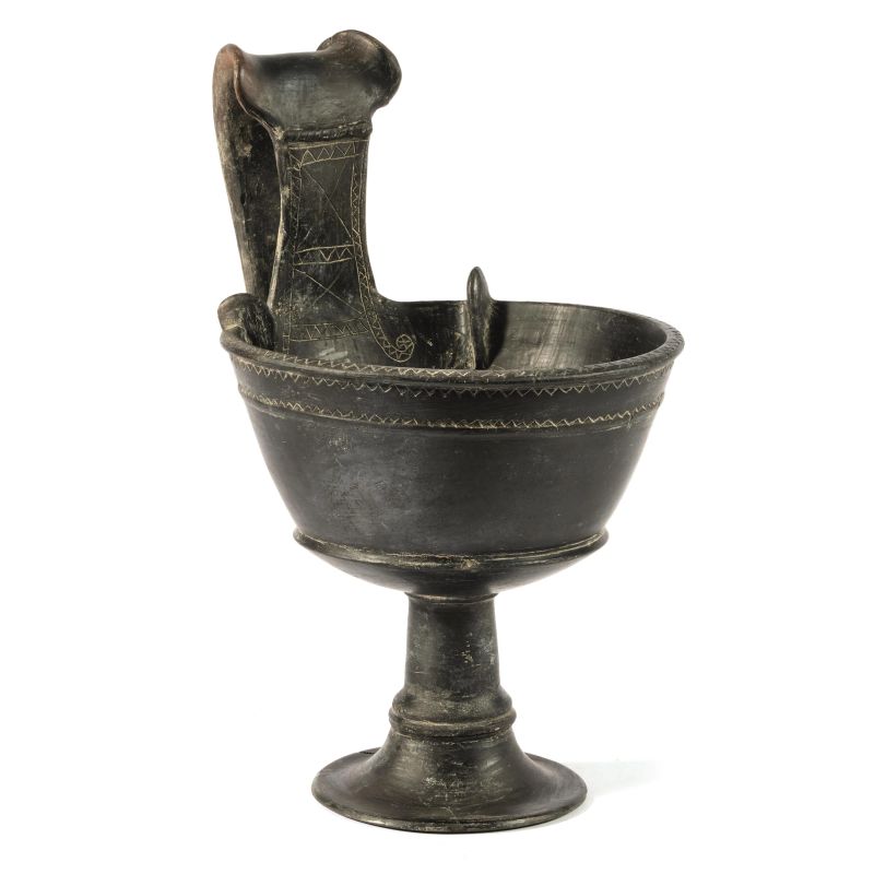 Presenta un alto labbro svasato con orlo appiattito e leggermente estroflesso, ampia vasca troncoconica, ampio piede a tromba con lungo stelo diviso centralmente da due anelli plastici a rilievo. Grande ansa a nastro impostata verticalmente sull'orlo e sulla vasca e due apofisi ovali visibili sull'orlo (ai lati dell'ansa). Le elaborate decorazioni consistono in incisioni caratterizzate da fasce che incentrano piccoli triangoli, presenti su ansa, orlo e vasca.