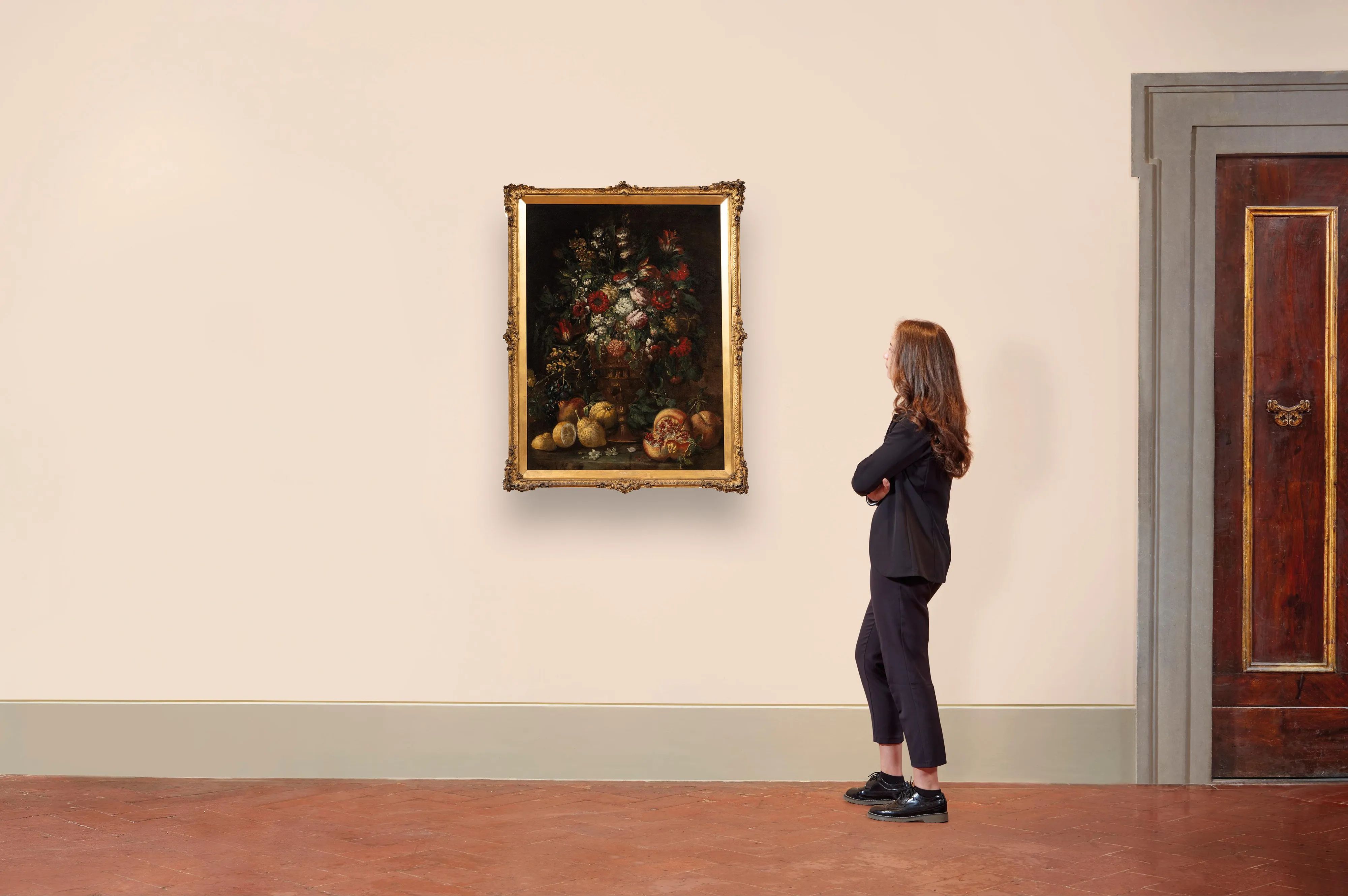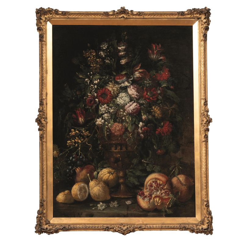 NATURA MORTA CON VASO DI FIORI, LIMONI E MELAGRANE