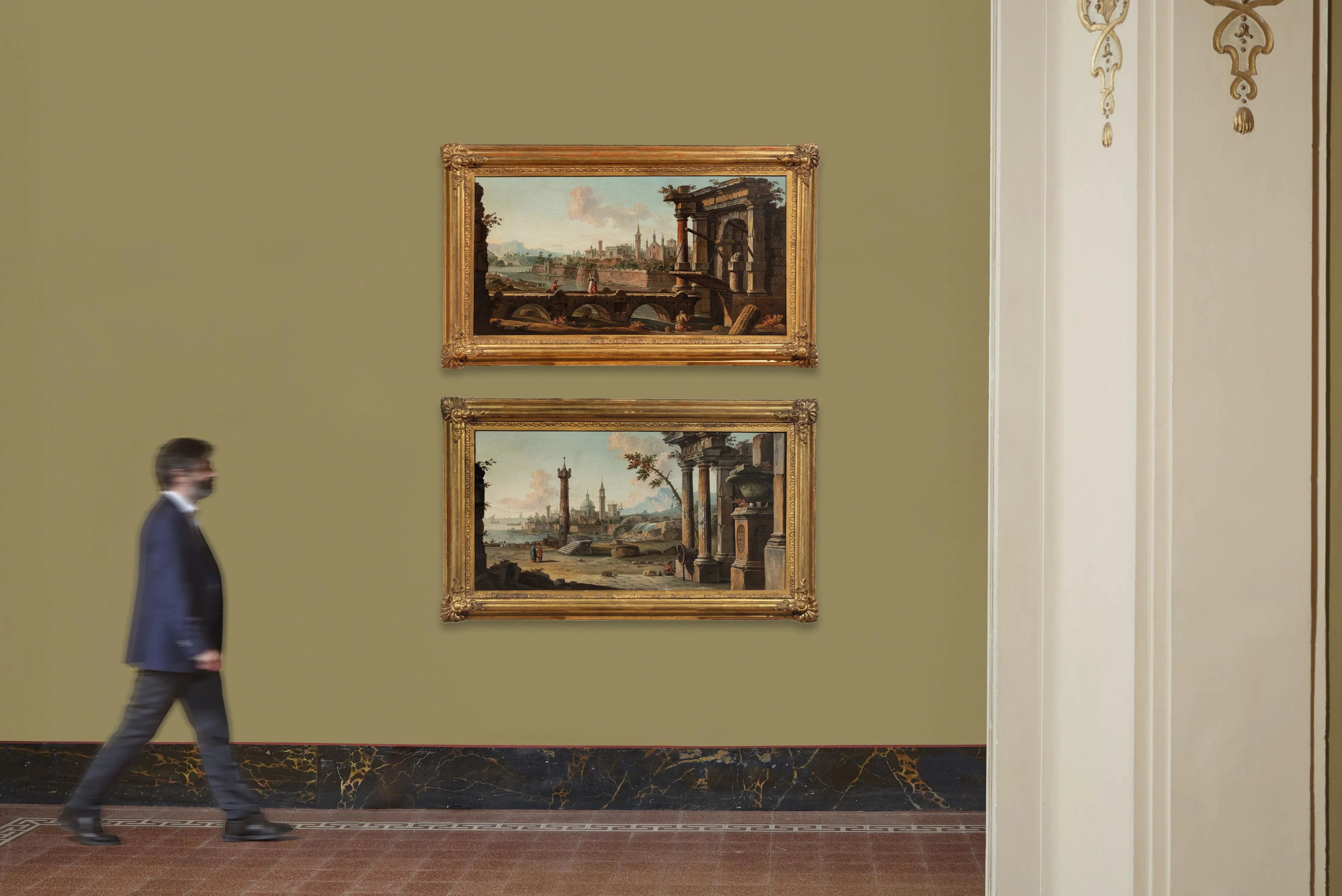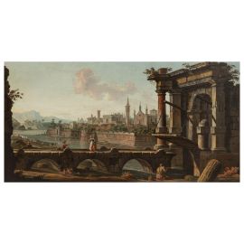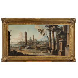 La coppia di vedute qui presentata, stesa con tavolozza tenue e nitida, rappresentano iconograficamente (molto probabilmente) il connubio tra paesaggi cittadini esistente ed elementi architettonici fantastici e arcadici sapientemente inseriti dall’artista. I brani pittorici risultano essere armoniosi, ben bilanciati con gli sfondi paesaggistici evanescenti ed “abitati” da colorate figure, eseguite con tutta probabilità da un valido collaboratore che coadiuvava il Maestro paesaggista, come spesso avveniva.
