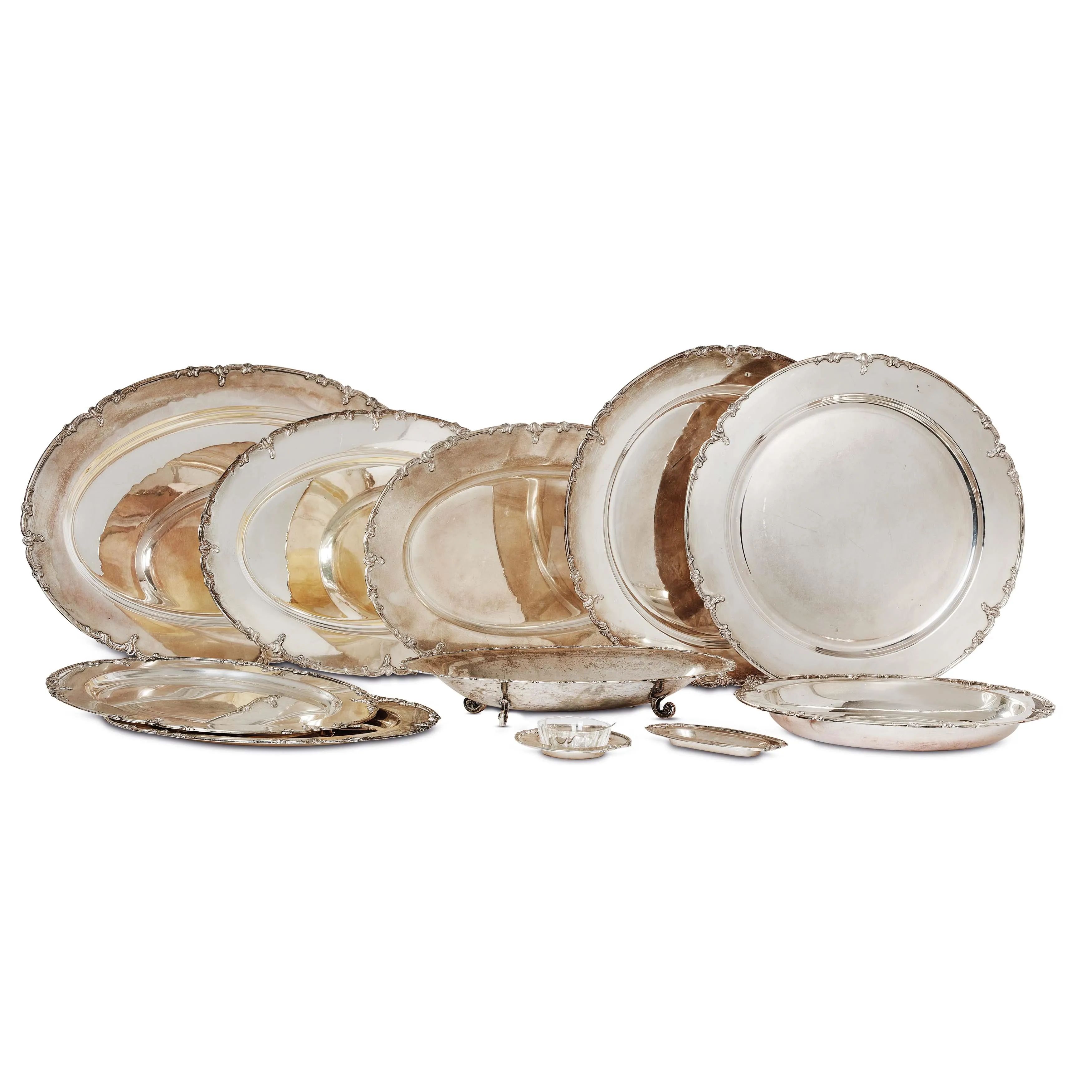 in argento, motivo a volute rocaille a decorare il bordo, composto da: un grande vassoio ovale, due vassoi ovali, un'alzata, due grandi piatti circolari, due piatti circolari, una vasca circolare, un piccolo vassoio ovale e una saliera in vetro con piattino e cucchiaio, peso complessivo gr. 8500