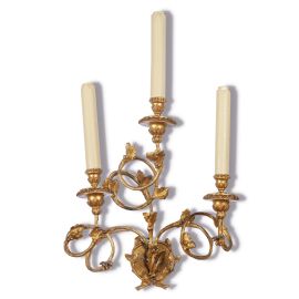 in legno intagliato e dorato a tre bracci lavorati a racemi vegetali con foglie ed elementi fitomorfi terminanti in bobeches, cm 50x30x20
