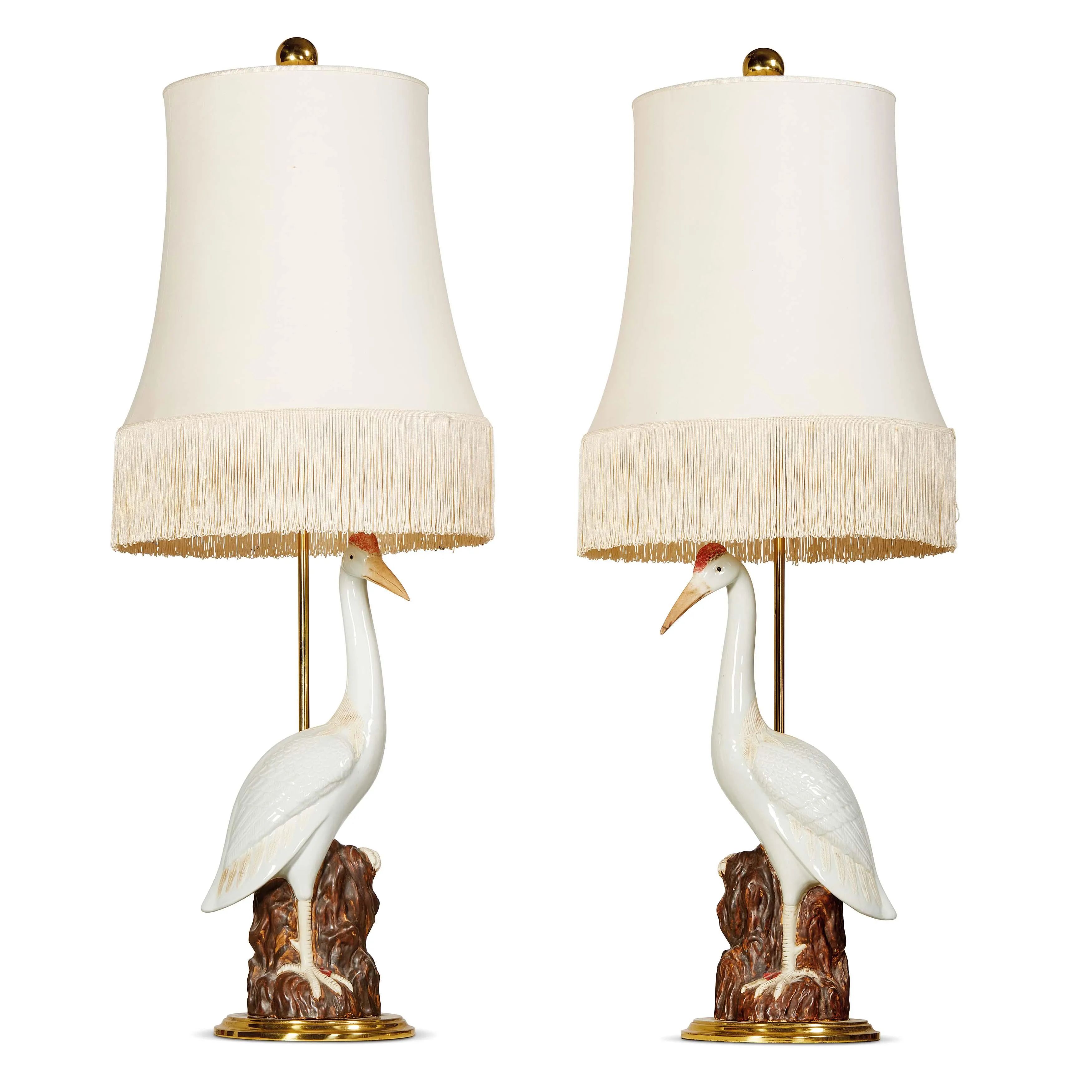 in porcellana policroma raffiguranti aironi su rocce, su basi circolari in metallo dorato e sormontati da grandi paralumi in tessuto, alt. cm 115