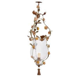 in vetro incolore a forma di campana sorretto da ramages di fiori in metallo dipinto, cm 103x34x34