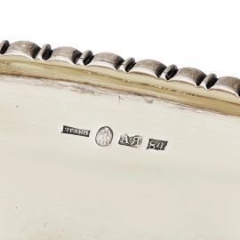 in argento, di forma ovale poggiante su base ad alzata, corpo percorso da baccellature, coperchio a cupola con presa a pigna, manici, cm 51x55,5x32; peso complessivo gr. 8260