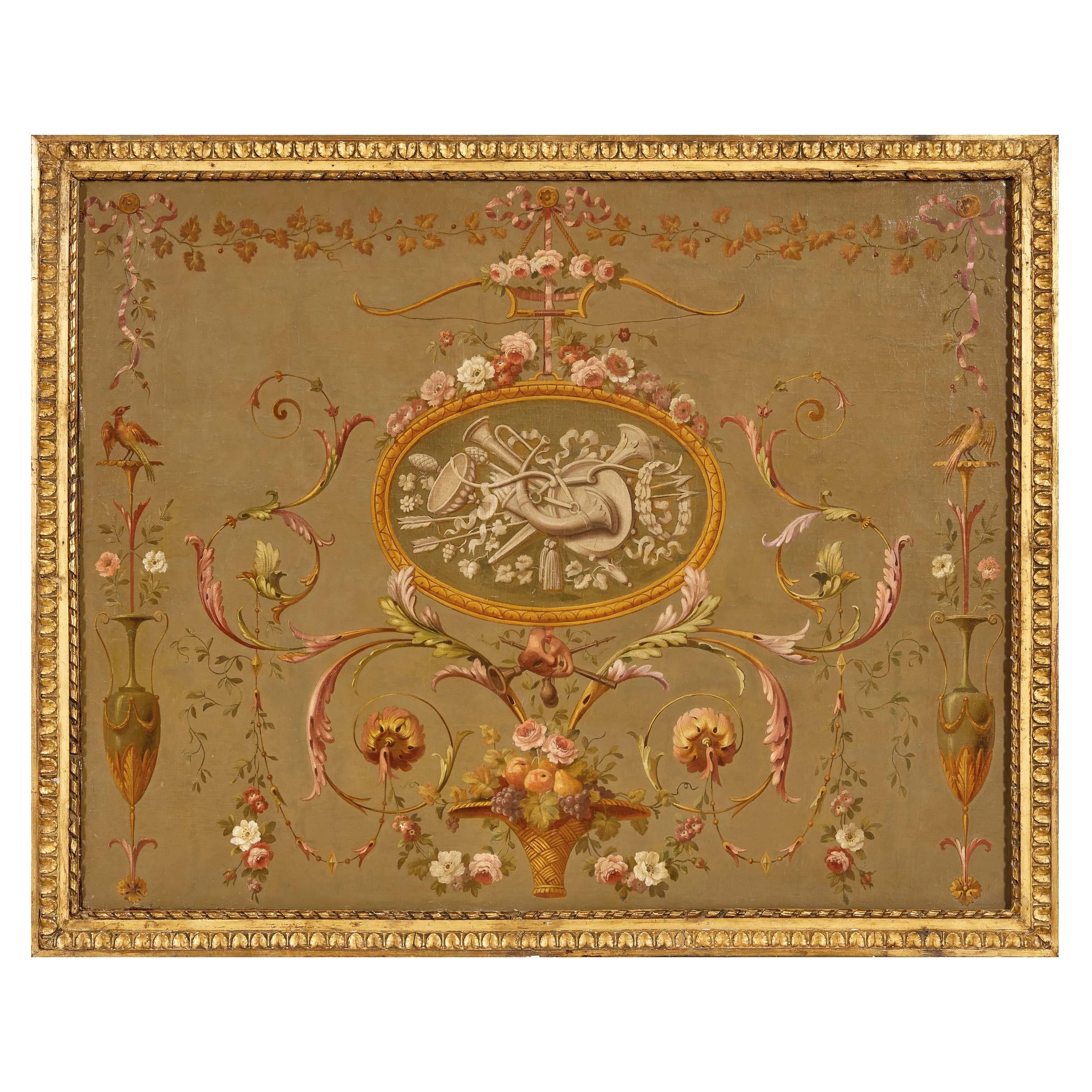 olio su tela applicata su tavola, raffigurante motivo decorativo naturalistico a grottesche con festoni di fiori e foglie, al centro medaglione ovale con strumenti musicali, mentre attorno un mascherone, vasi di frutta e fiori e ai lati anfore e uccellini, cm 122x151