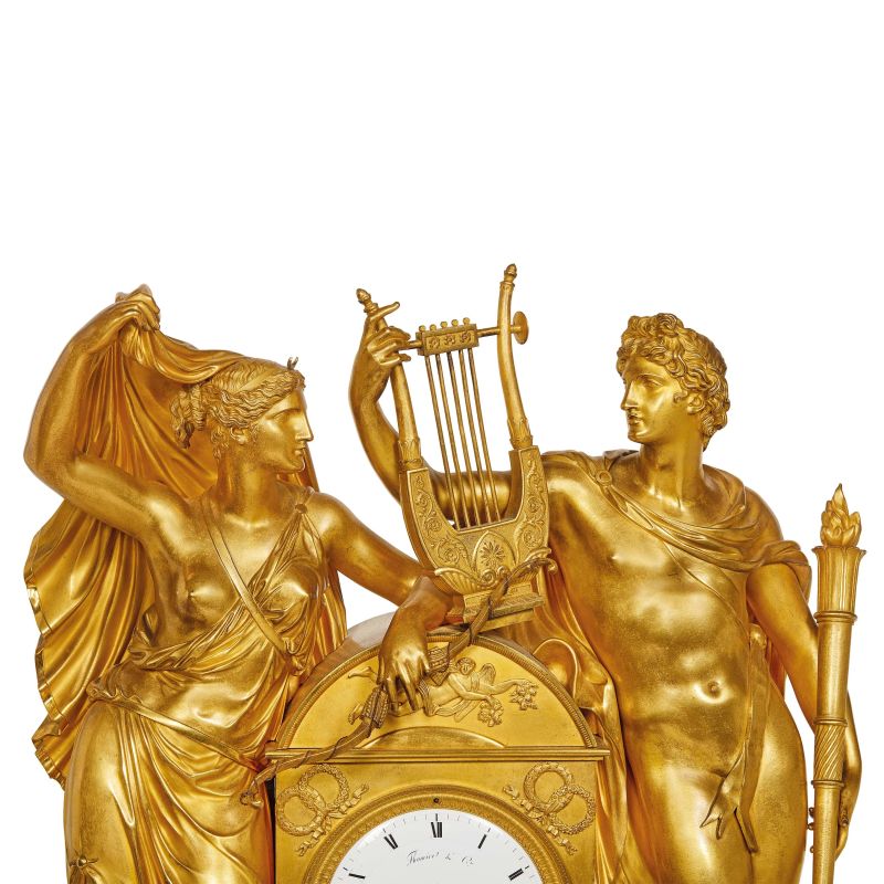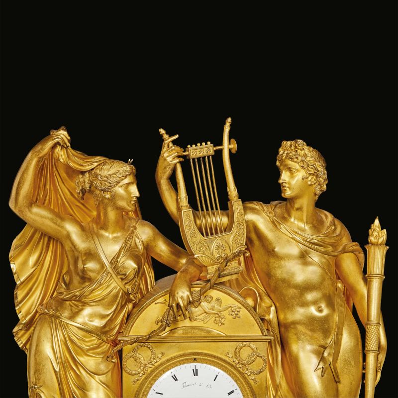 in bronzo dorato raffigurante Apollo e Diana, stanti ai lati della cassa di forma architettonica ornata agli angoli da doppia corona legata da nastri, quadrante smaltato con numeri romani firmato Thomire & Cie e Moinet ainé Hr., su base a plinto ornata sul fronte da fregio a torcere dalle quali si dipartono festoni che inquadrano motivi decorativi classici, cm 67x55x19,5