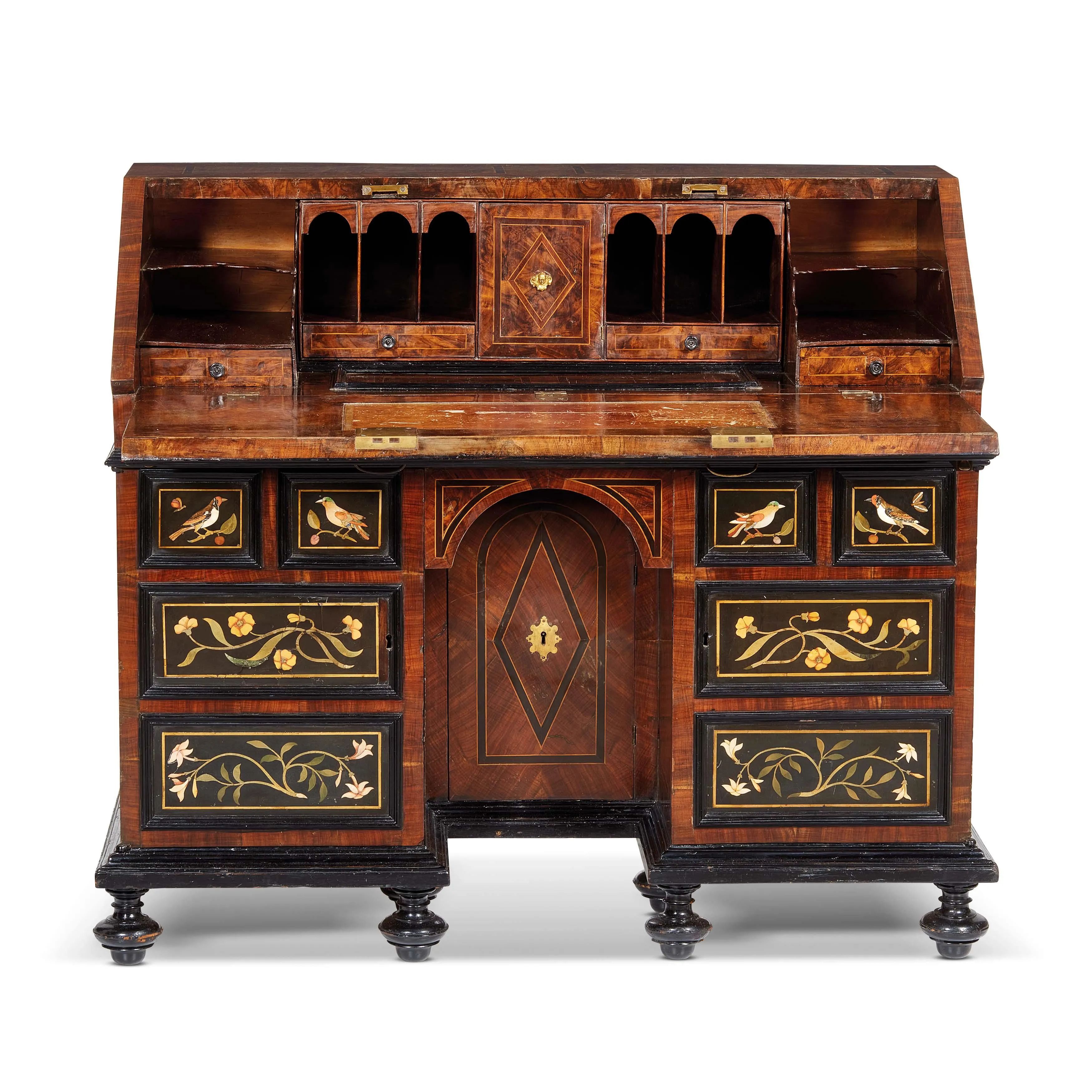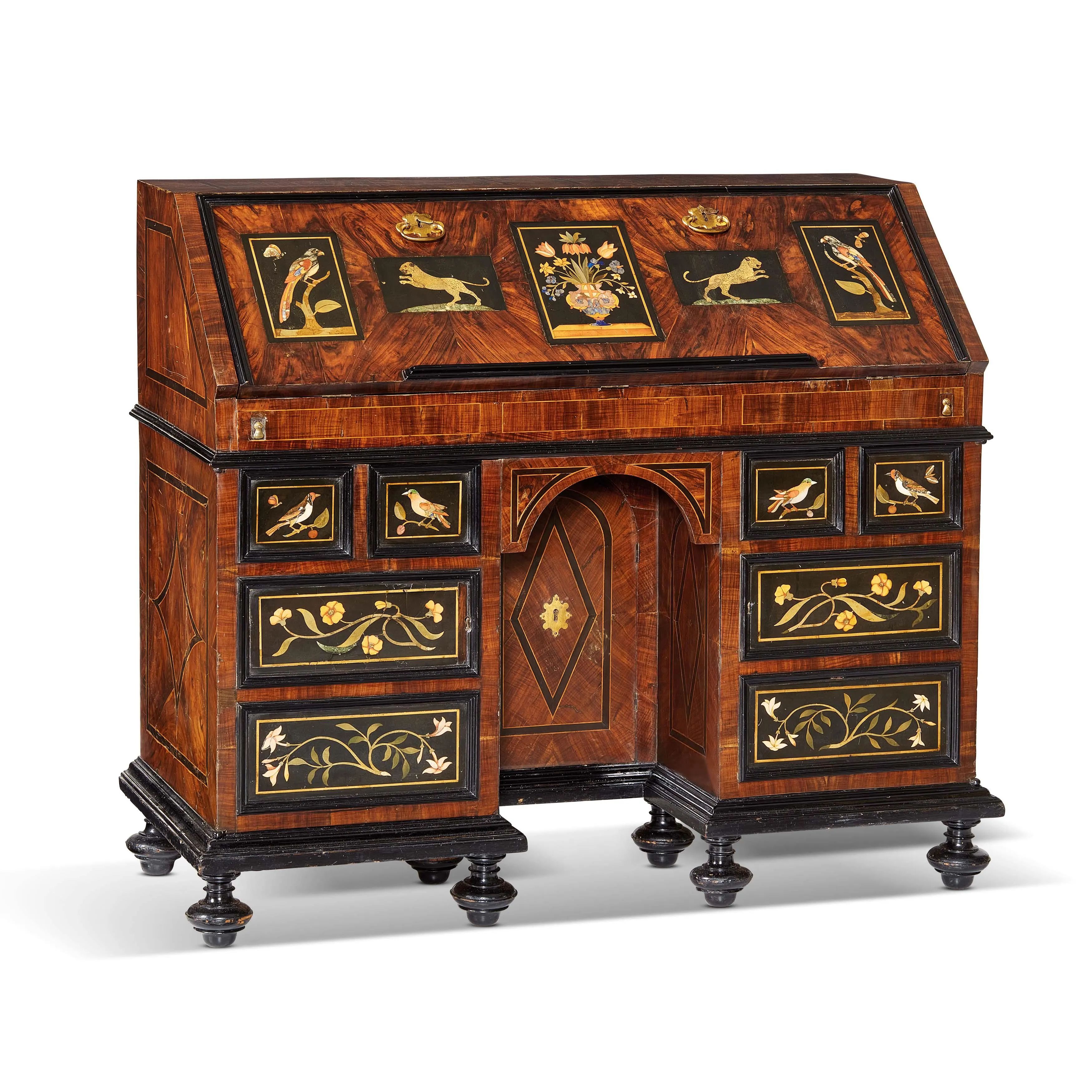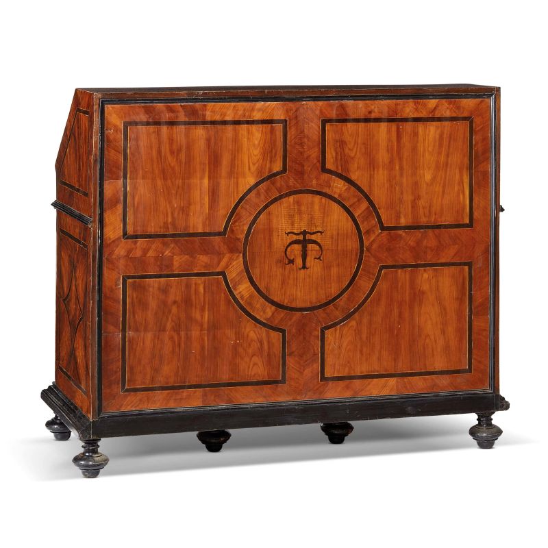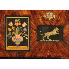 in legno lastronato con profili ebanizzati; la ribalta frontale, impreziosita da cinque placche in commesso di pietre dure su fondo in marmo nero raffiguranti uccellini, felini e al centro un vaso di fiori, cela piano scrittoio, vani, cassettini e un segreto a scorrimento. La parte sottostante del fronte è interessata da due sportelli laterali, anch'essi decorati da placche in commesso pietre dure su fondo in marmo nero, raffiguranti uccellini e ramages floreali e incorniciate da profili ebanizzati, e da uno sportellino centrale filettato in ebano con motivo romboidale. Al retro profilatura centrata da tondo siglato TC; su piedi a sfera schiacciata, cm 110x127x56