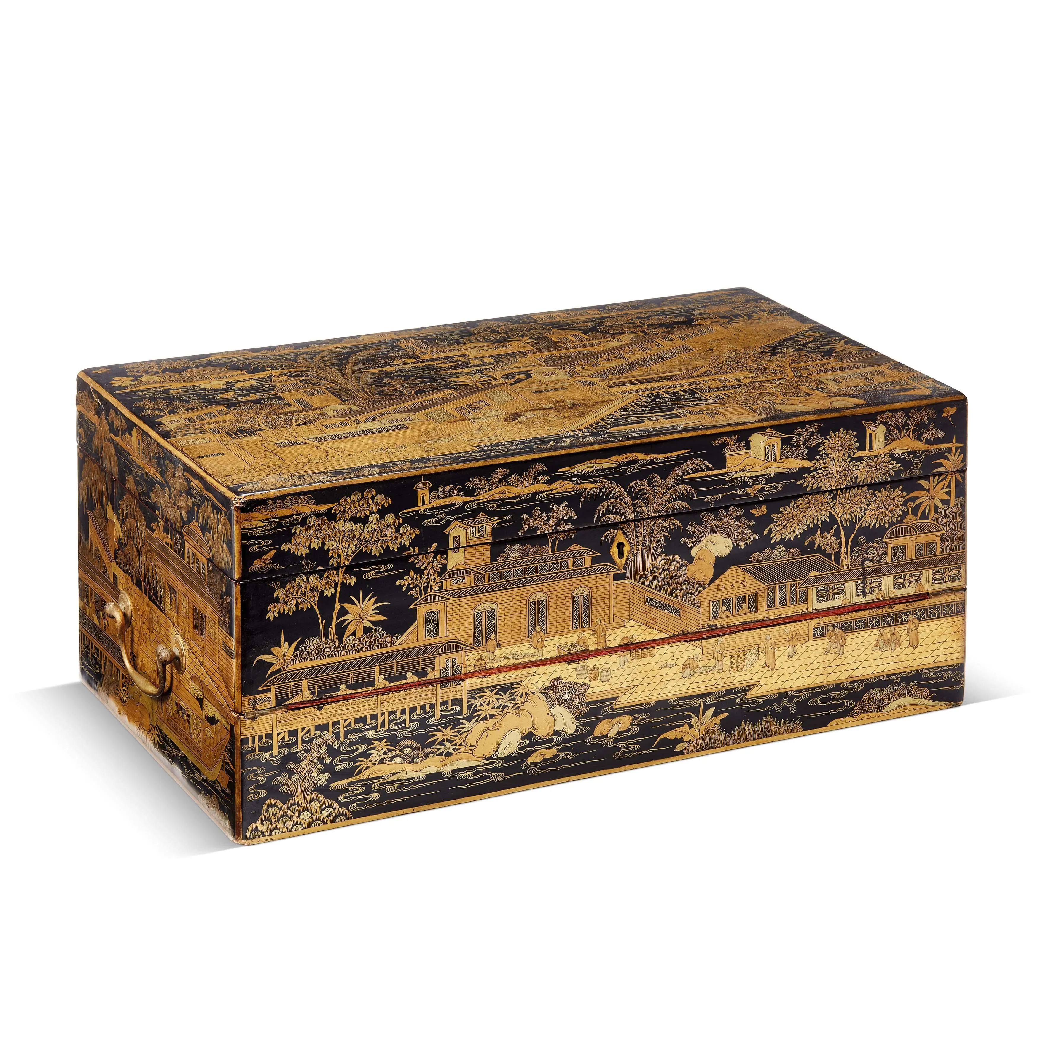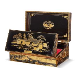 in lacca giapponese, raffigurante su ciascun lato paesaggio con figure a chinoiserie; coperchio apribile a celare piano scrittoio in velluto rosso e diversi vani, cm 20x46,5x26,5