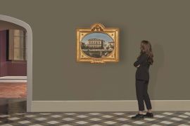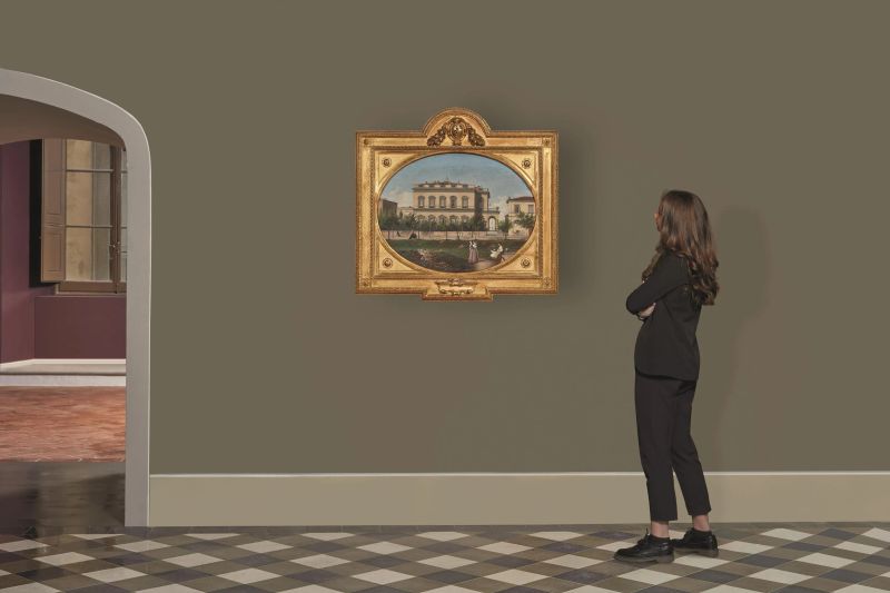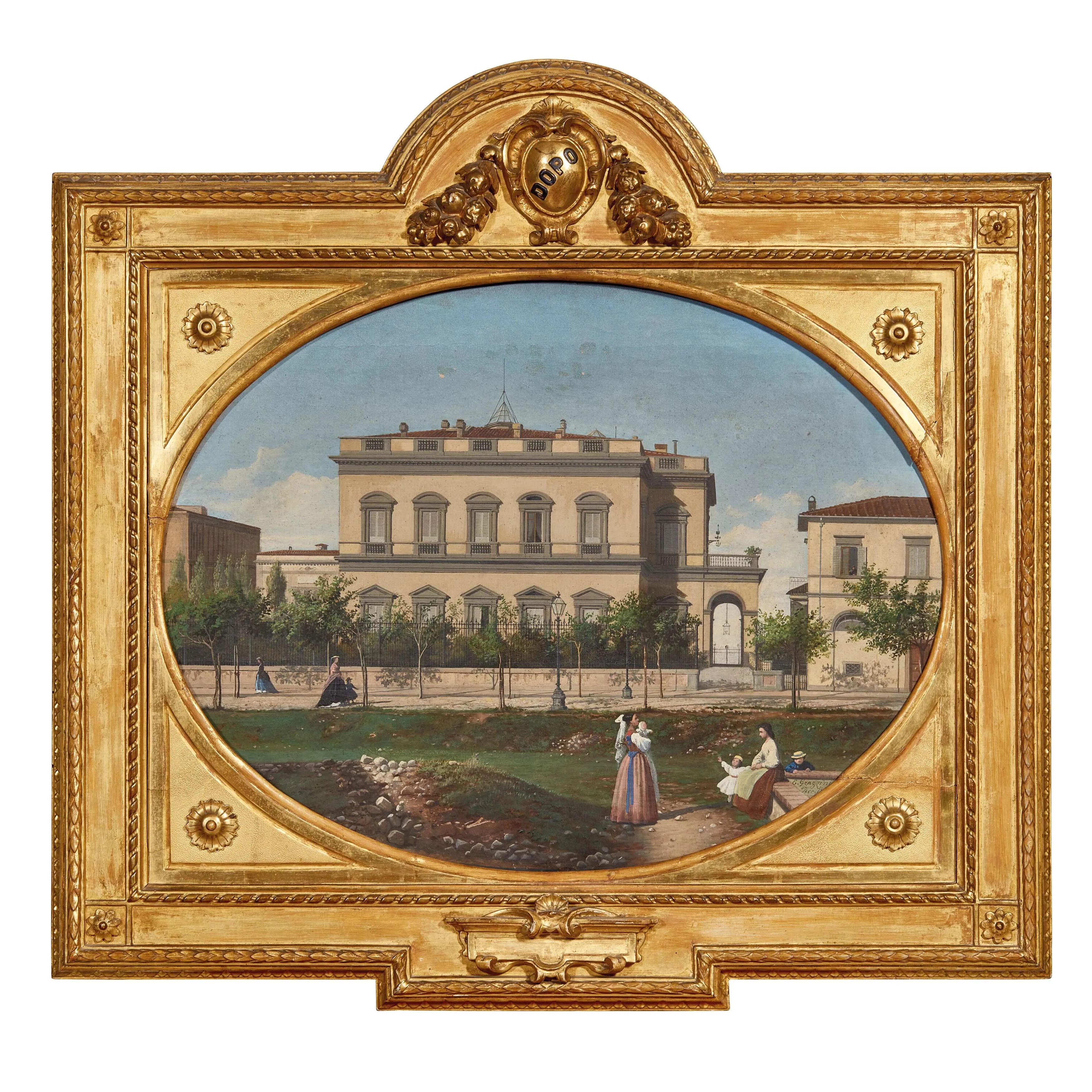 olio su tela, cm 50x65,5, entro cornice in legno intagliato e dorato di forma sagomata, cm 80x83,5
