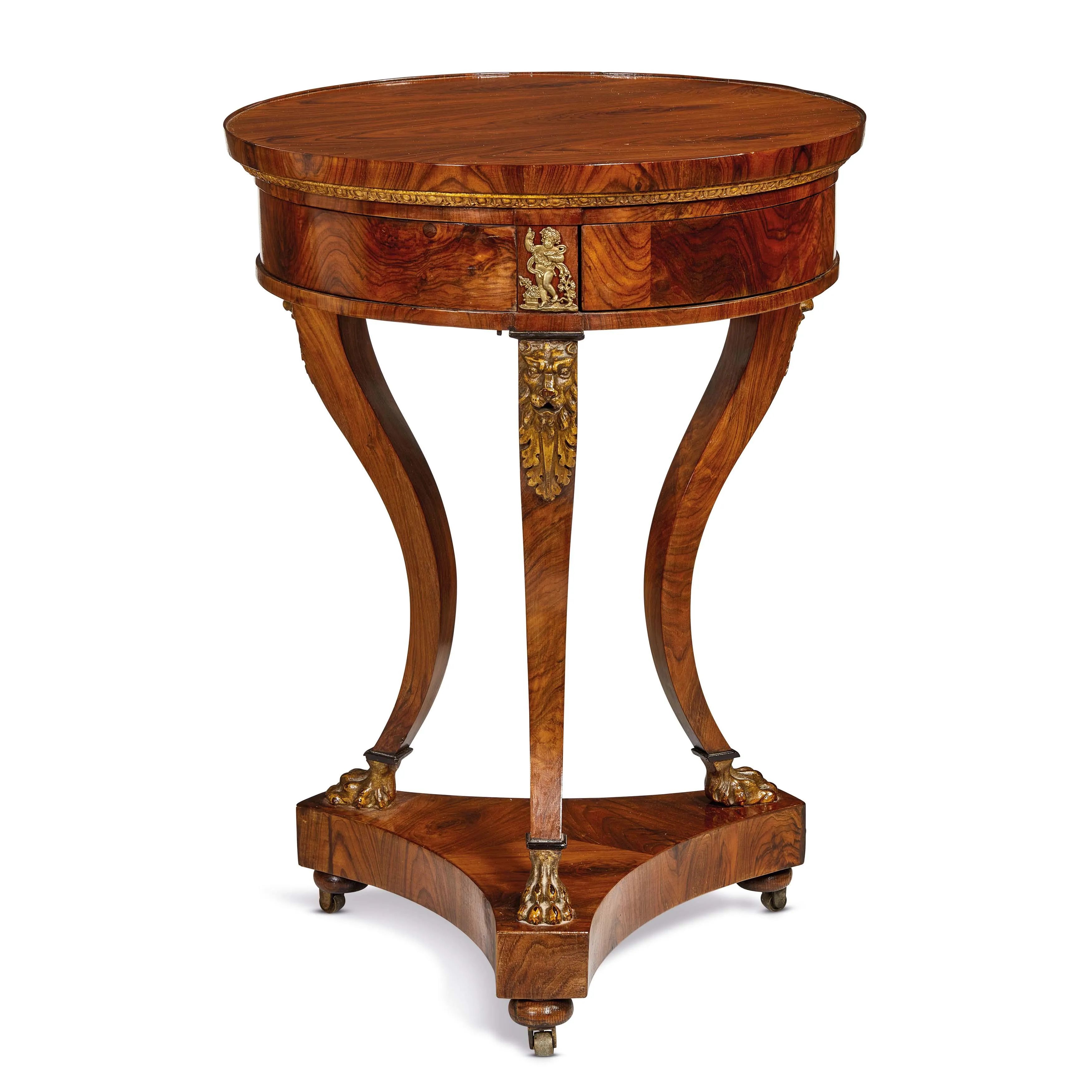 in mogano, piano di forma circolare, su fascia liscia apribile a tre vani intervallati da figure di Bacco in bronzo dorato, teste leonine in legno dipinto a reggere gambe sinuose terminanti in piedi ferini, su base polilobata con ruotine, alt. cm 89 e diam. cm 57