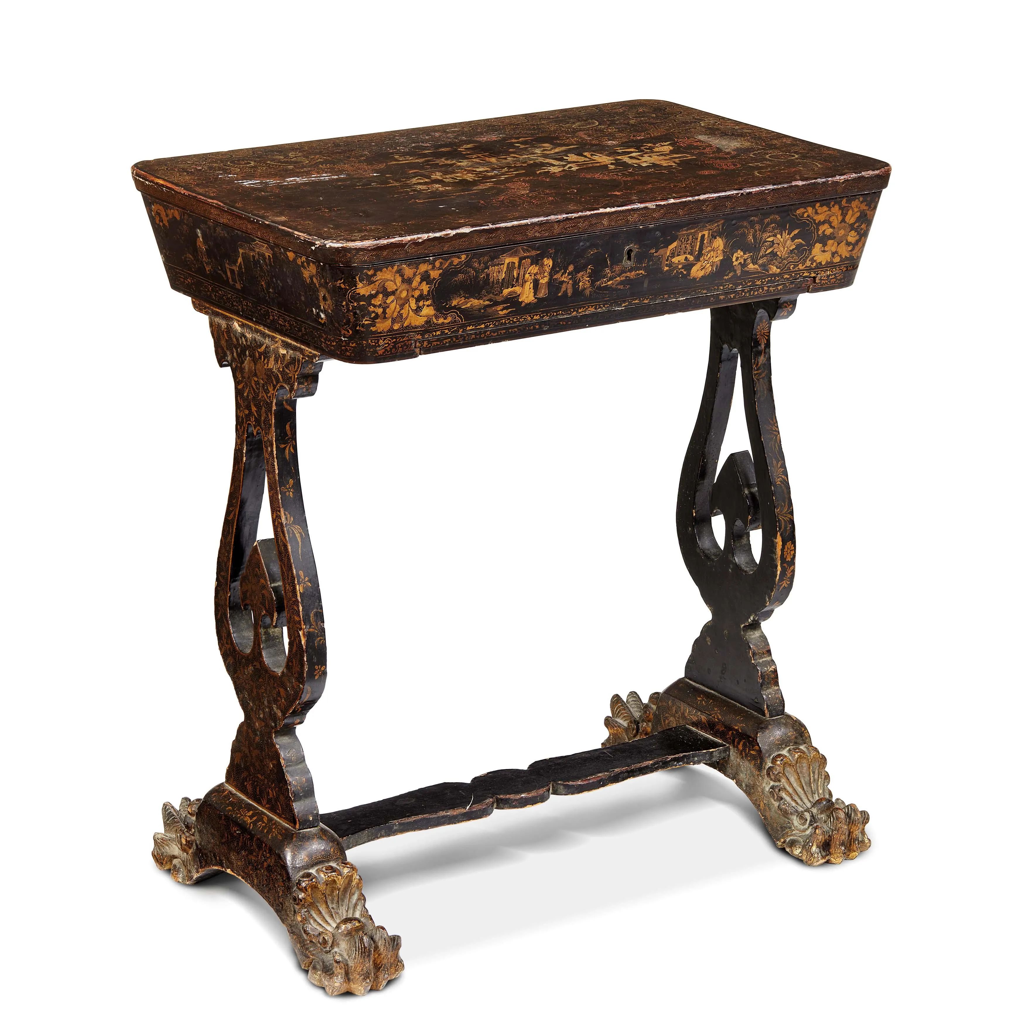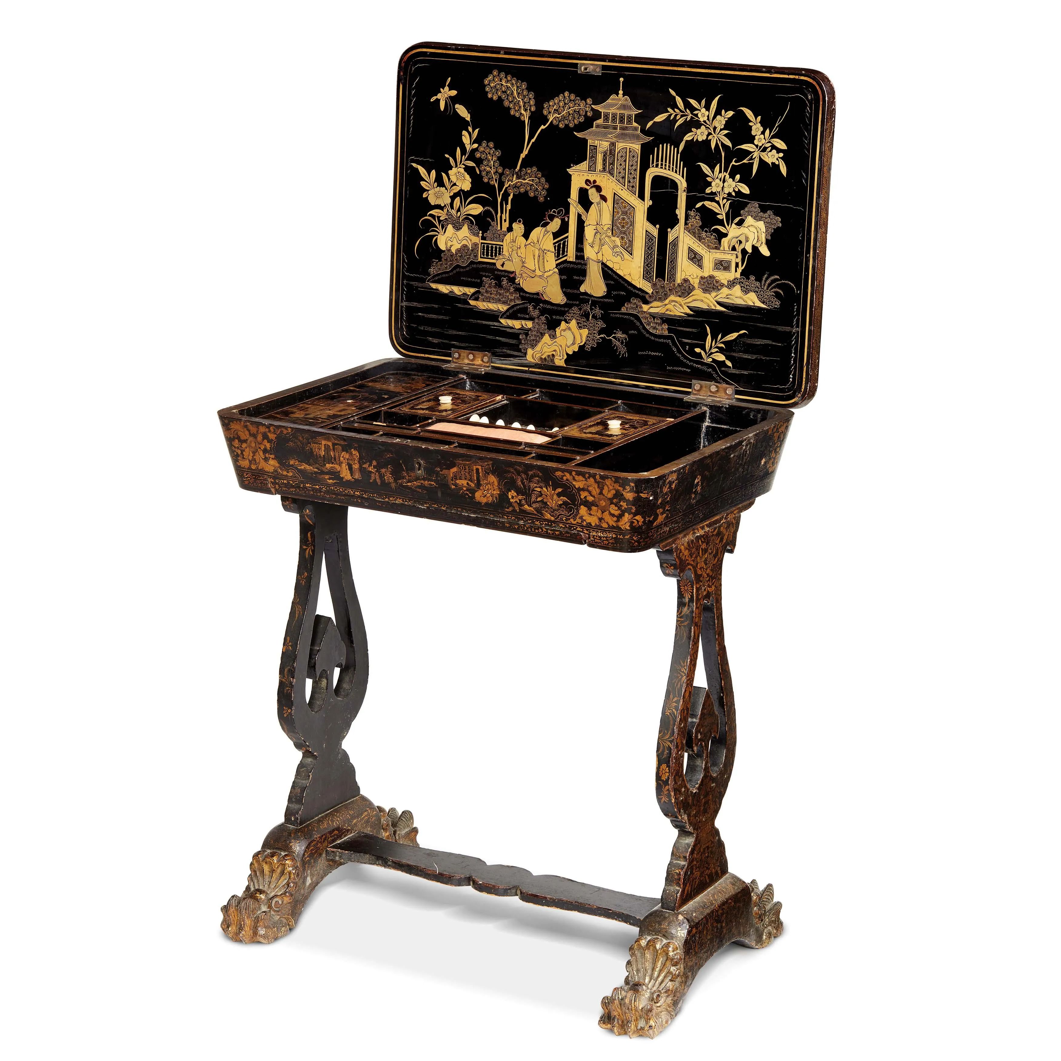 in legno ebanizzato e laccato a chinoiserie raffigurante figure entro paesaggio e decorazione floreale, piano apribile a celare vani, gambe a lira riunite da traversa e terminanti in piedi scolpiti in foggia ferina, cm 71x62x42