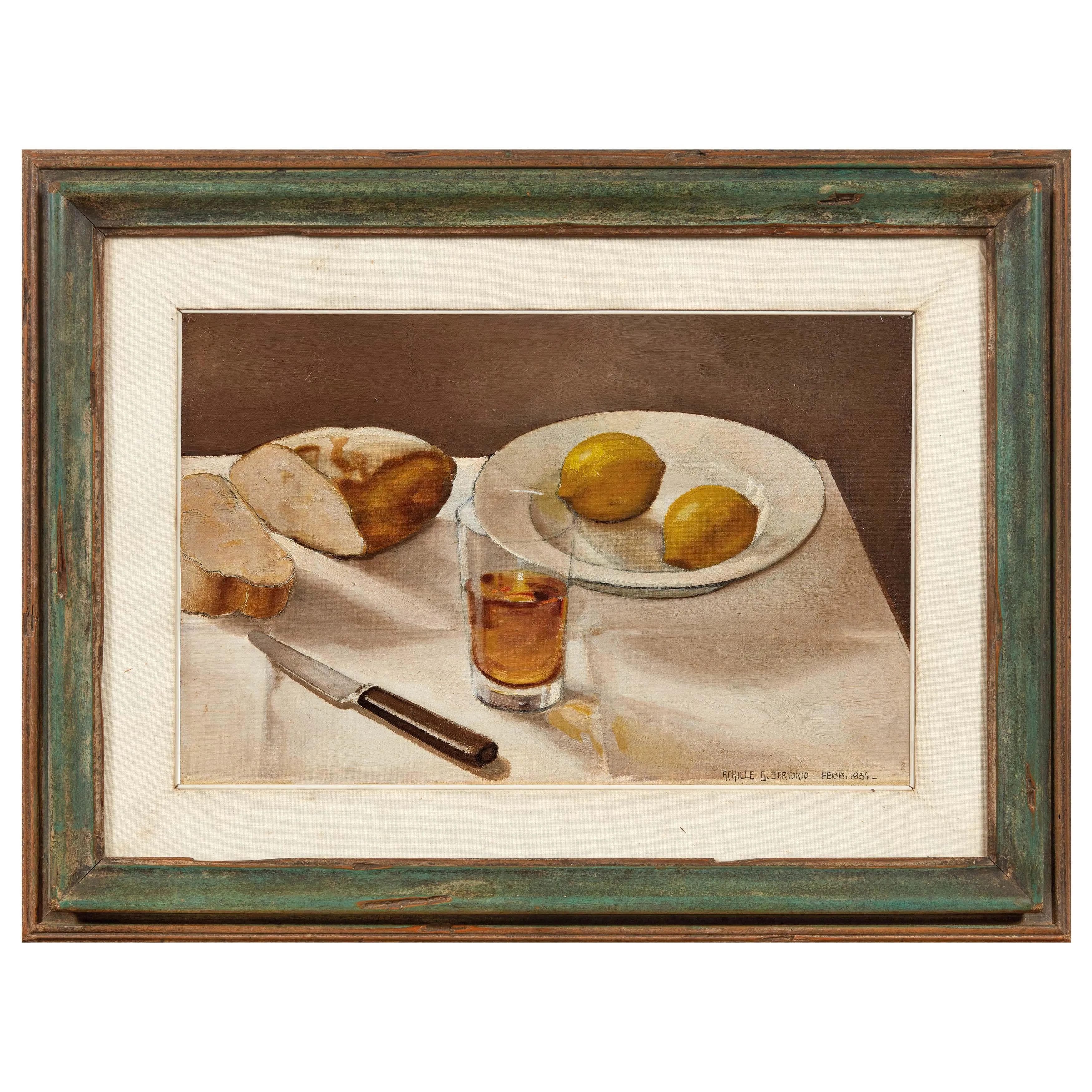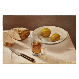 NATURA MORTA CON LIMONI, PANE E BICCHIERE DI VINO