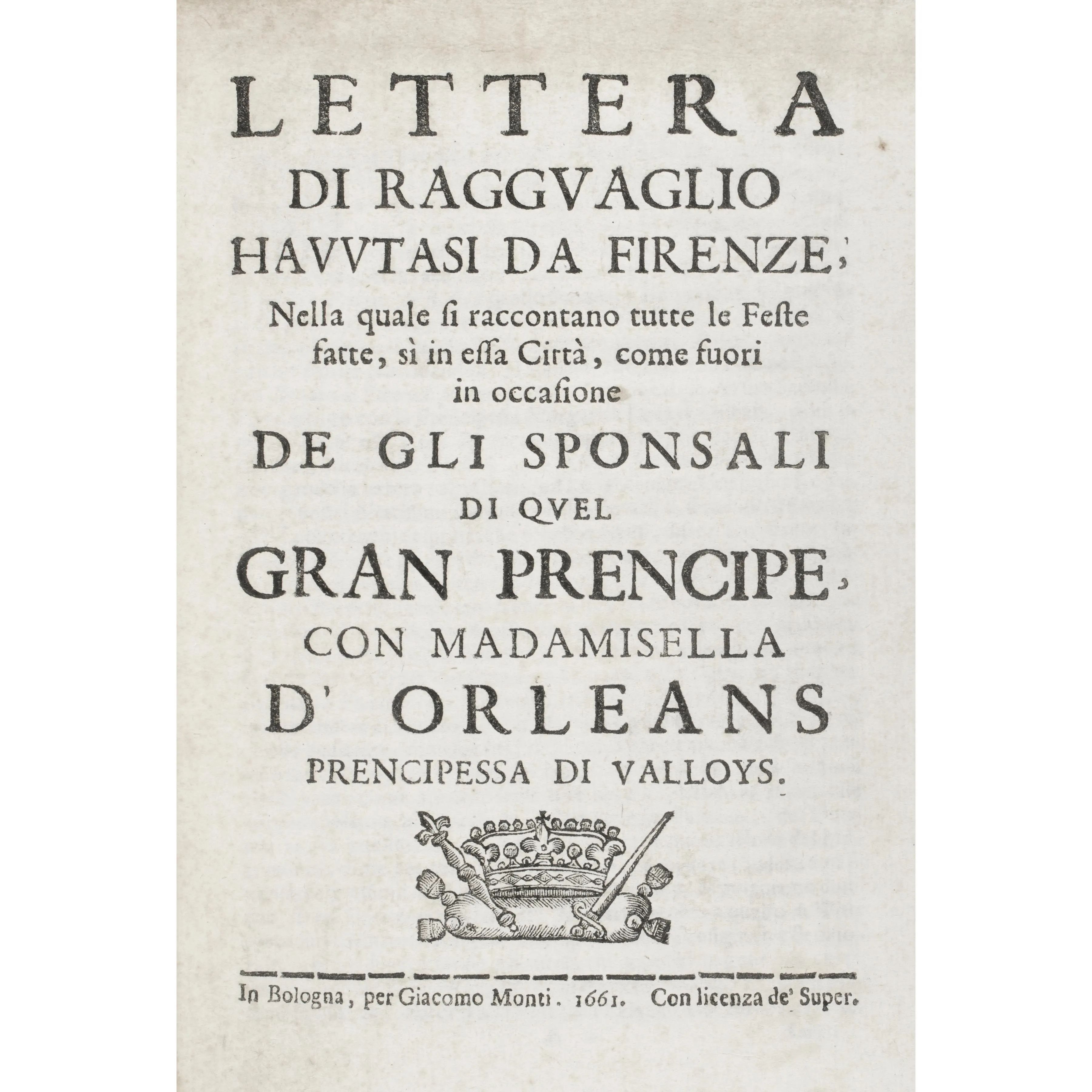 [Firenze]. Lettera di ragguaglio havutasi da Firenze … in occasione de gli sponsali di quel gran prencipe con madamisella d’Orleans, prencipessa di Valloys. Bologna, Monti, 1661.