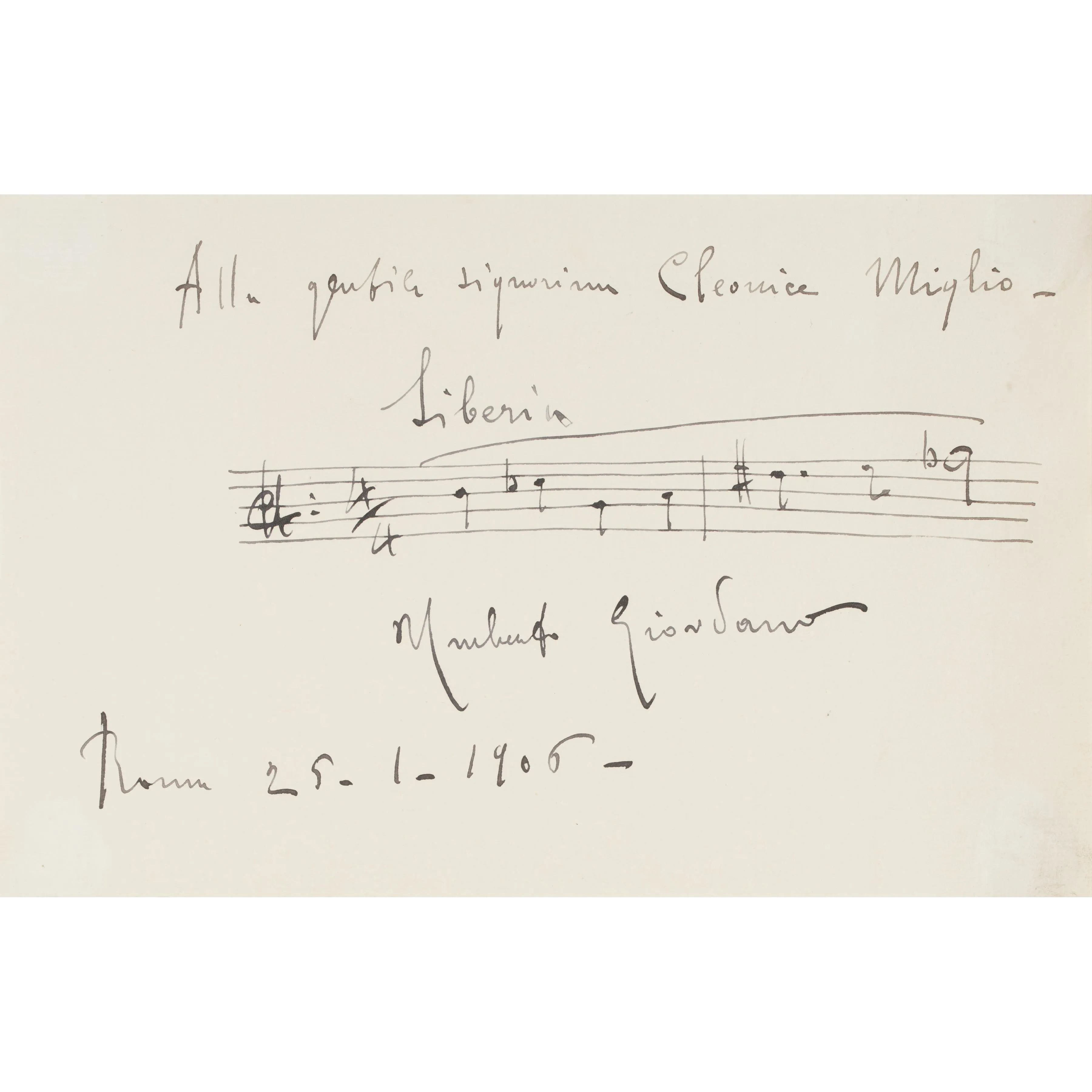 Giordano, Umberto. Citazione autografa firmata, due battute dalla Siberia, con dedica e data ‘Roma, 25. I.1906’.