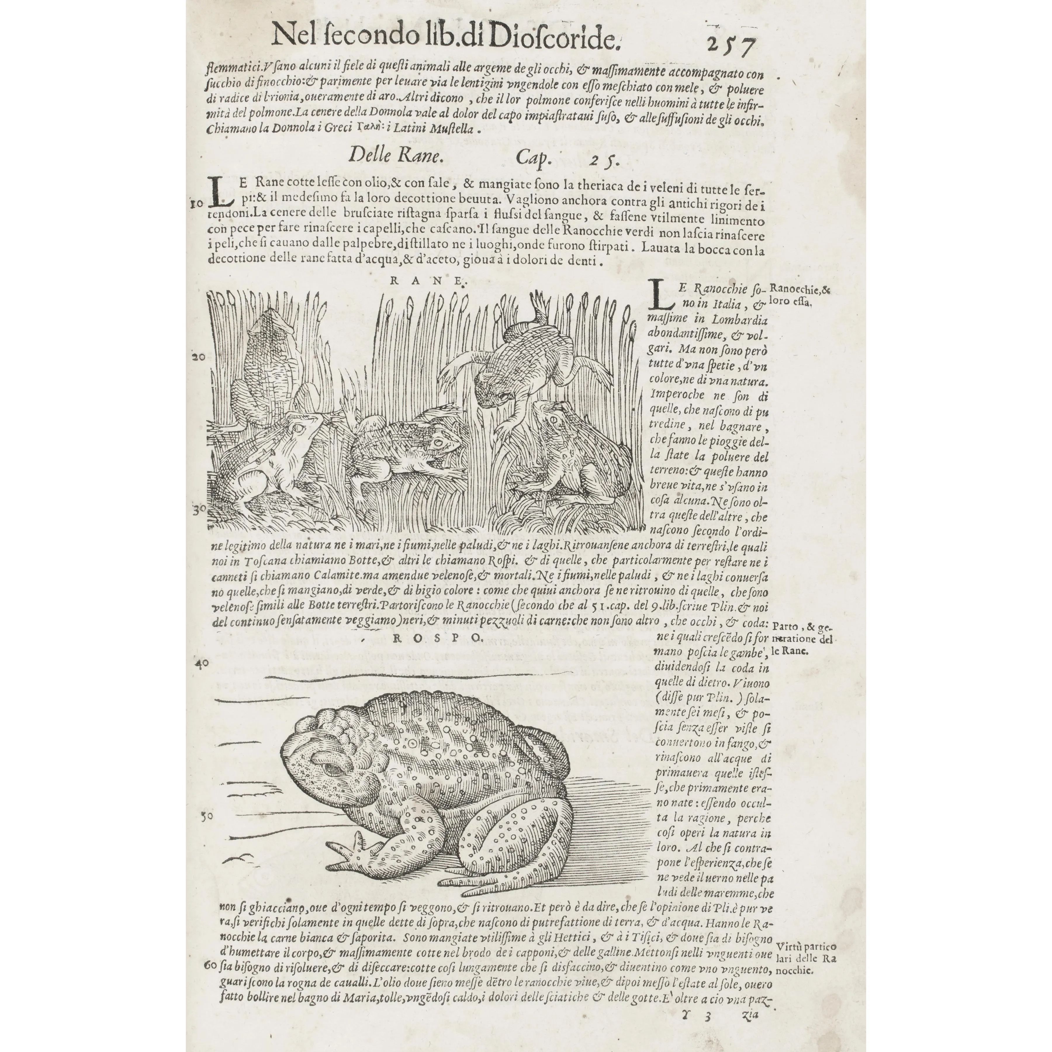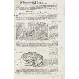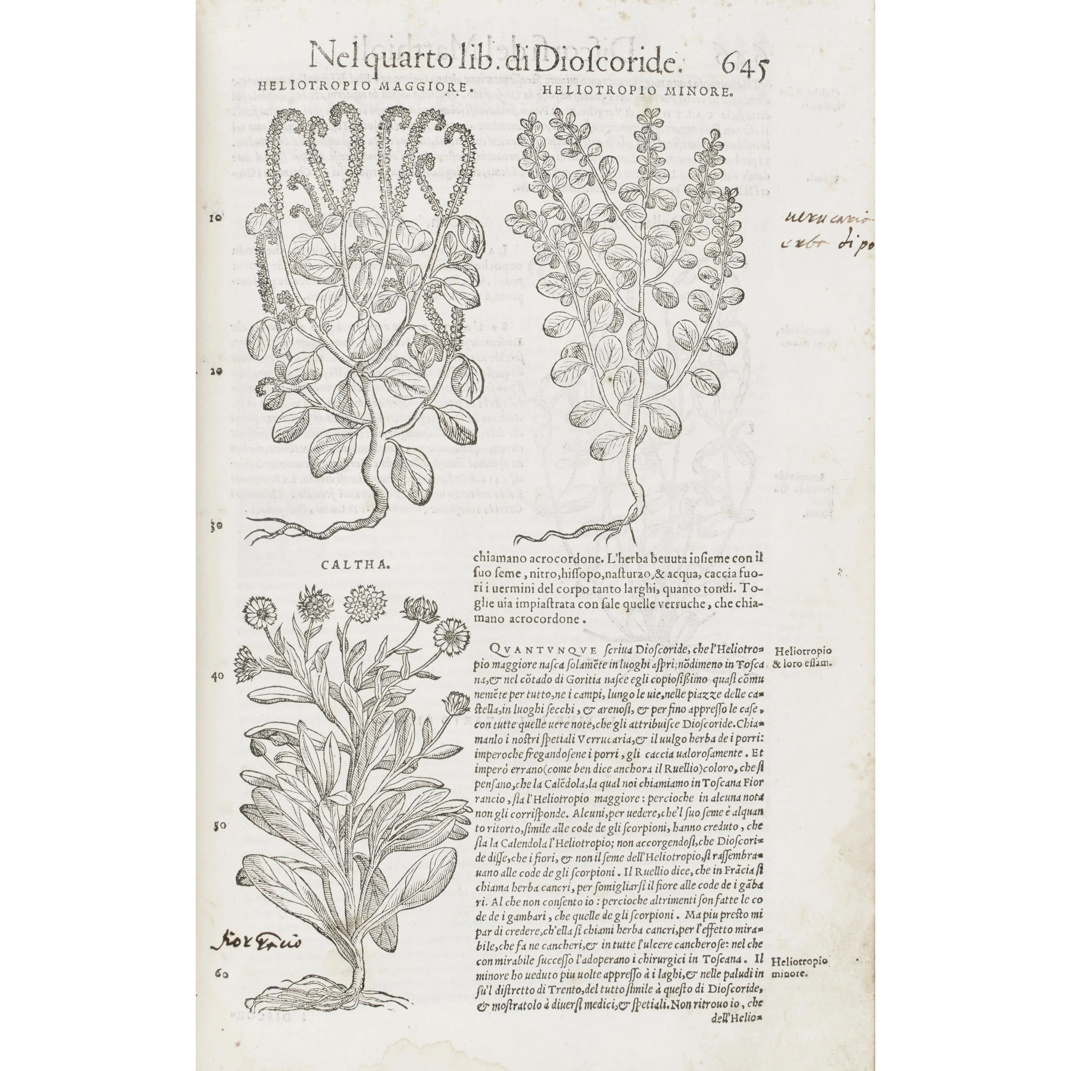 Lotto composto da tre edizioni uscite dai torchi di Vincenzo Valgrisi negli anni 1563, 1570 e 1581 del celeberrimo erbario di Pietro Andrea Mattioli, a testimonianza della straordinaria fortuna editoriale di un’opera autenticamente enciclopedica e imprescindibile per la storia della botanica e della medicina rinascimentale. Esemplari di studio, non esenti da difetti ma ricchi di un fitto corredo illustrativo, che documentano l’evoluzione e la diffusione di uno dei testi più influenti del sapere scientifico del Cinquecento, capace di coniugare rigore descrittivo, utilità pratica e straordinaria ricchezza iconografica.