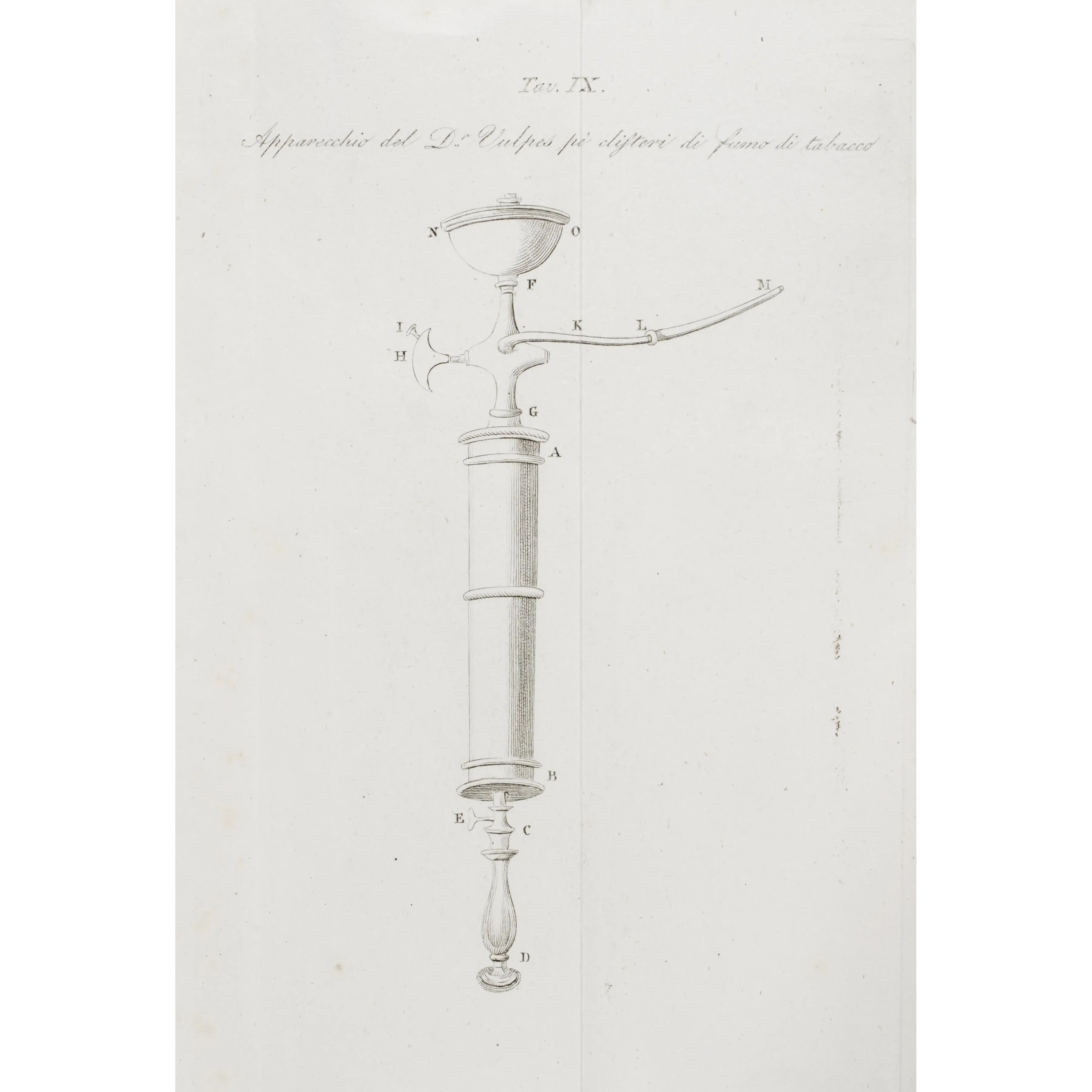 Quarta edizione con, al foglio di guardia lunga dedica autografa dell’autore. Le tavole in fine volume mostrano gli strumenti medici che servono per diagnosticare e salvare una persona dalla morte apparente che all’epoca mieteva ancora molte vittime. Tra queste, la più curiosa raffigura uno strumento per i ‘Clisteri di fumo di tabacco’.