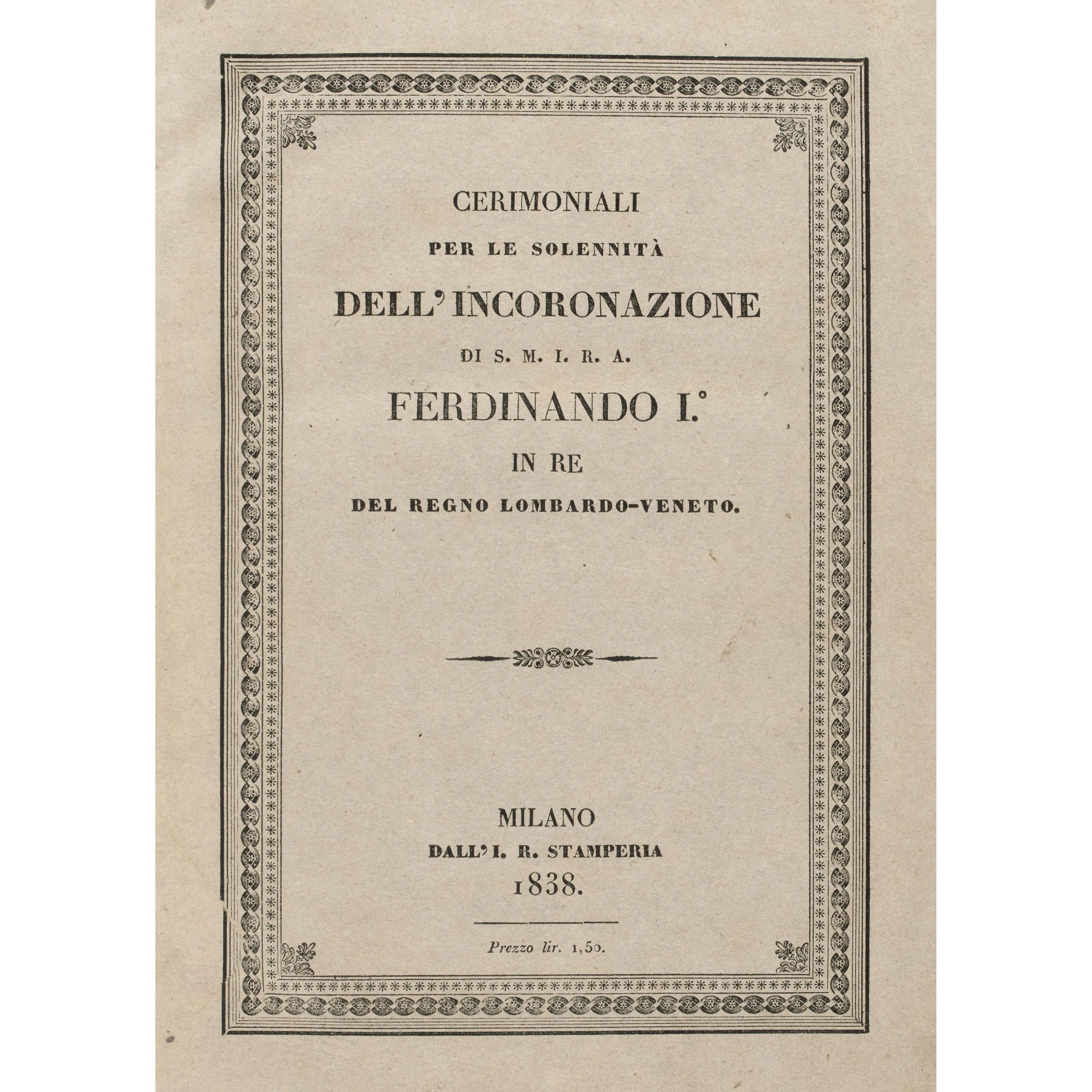 Cerimoniali per le solennità dell'incoronazione di S.M.I.R.A. Ferdinando I. Milano, Imperial Regia Stamperia, 1838. Legato con Giuseppe Reina. Descrizione dell'arco della pace. Milano, Guglielmini, 1838