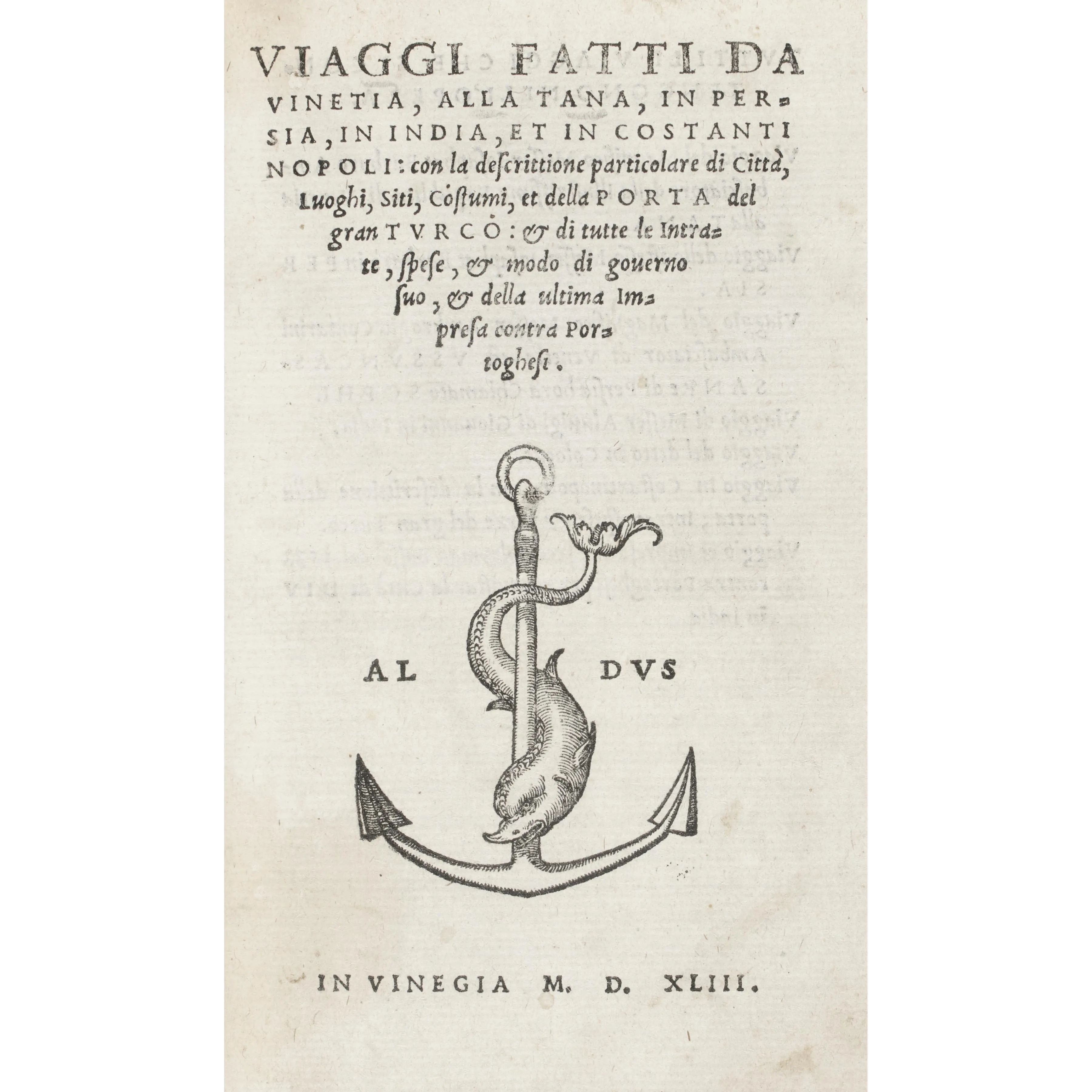 [Manuzio, Antonio]. Viaggi fatti da Vinegia alla Tana in Persia, in India et in Costantinopoli... Venezia, eredi di Aldo, 1543.