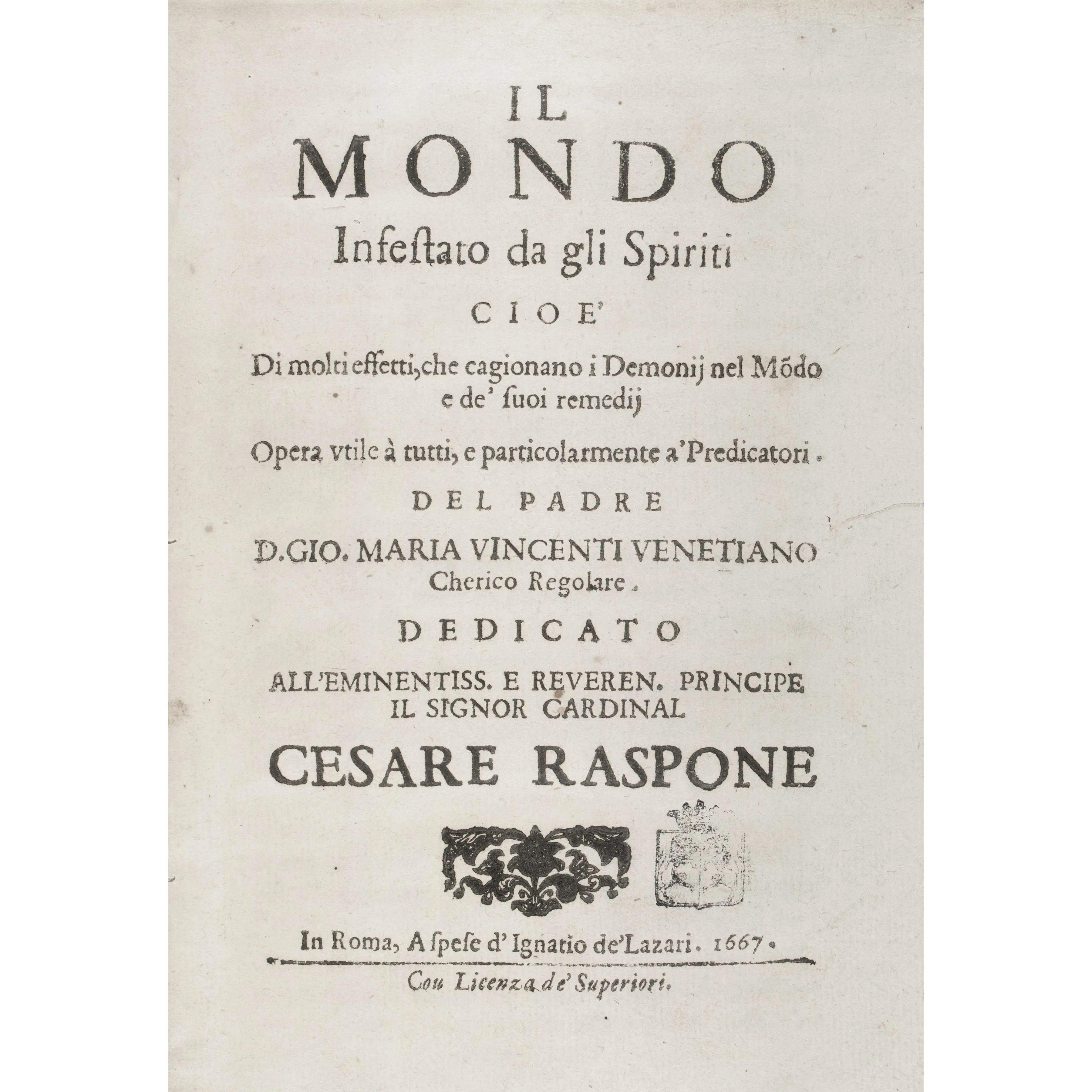 Vincenti, Giovanni Maria. Il mondo infestato dagli spiriti cioè di molti effetti che cagionano i Demonij nel mondo e de’ suoi rimedi. Roma, de’ Lazzari, 1667.