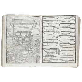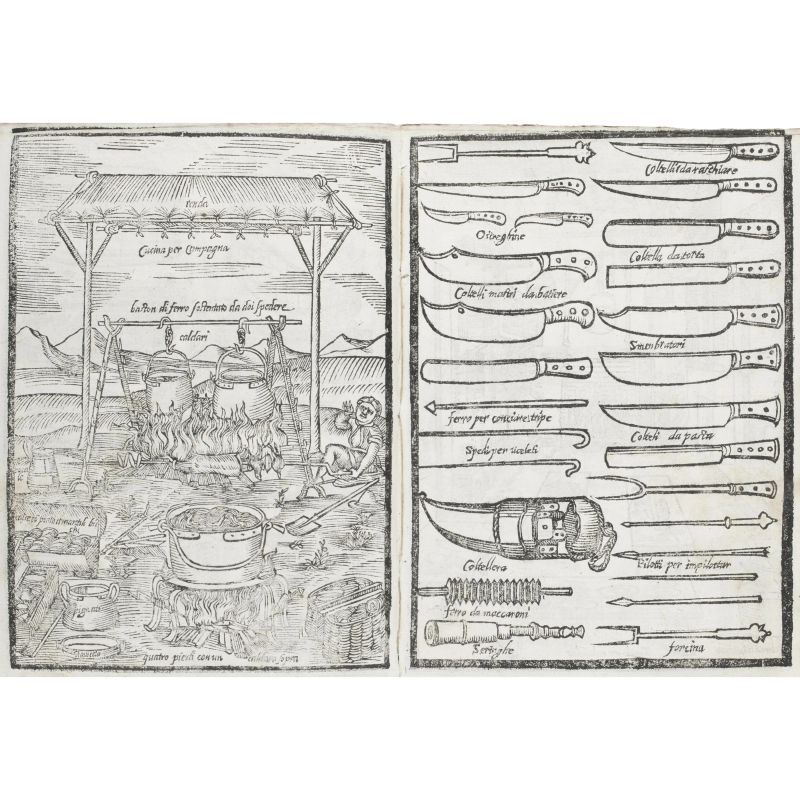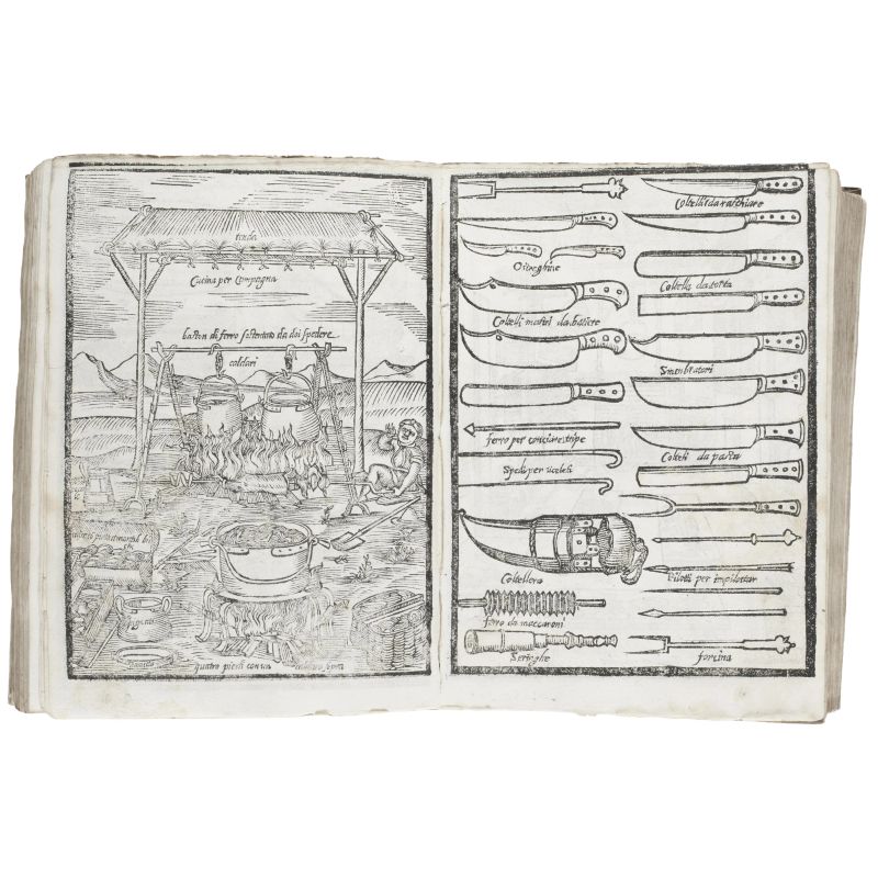 Bell’esemplare senza il Trinciante ma con il Maestro di Casa in fine volume. Simon, Bibliotheca Gastronomica: “The plates are so attractive that copies containing them all are extremely rare; they represent all kinds of kitchen utensils, kitchen interiors, furniture, fireplaces, etc., whilst a double-page plate represents the various dishes and wines brought by servants to the examiners before being sent in to the Cardinals sitting in Conclave, in 1549”.