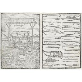 Due tomi in un volume in quarto (200 x 140 mm); [4], 310 carte; 22 pagine. Due frontespizi con vignette xilografiche, ritratto dell’autore in ovale inciso in rame, 27 tavole incise in legno delle quali una a doppia pagina (manca la carta E8, sporadiche piccole macchie, lenti alcuni fascicoli.) Legatura coeva in piena pergamena floscia, titolo manoscritto al dorso, ai fogli di guardia note di Francesco Rusca che dichiara l’acquisto a Venezia l’8 febbraio del 1619 (pochi i segni del tempo).