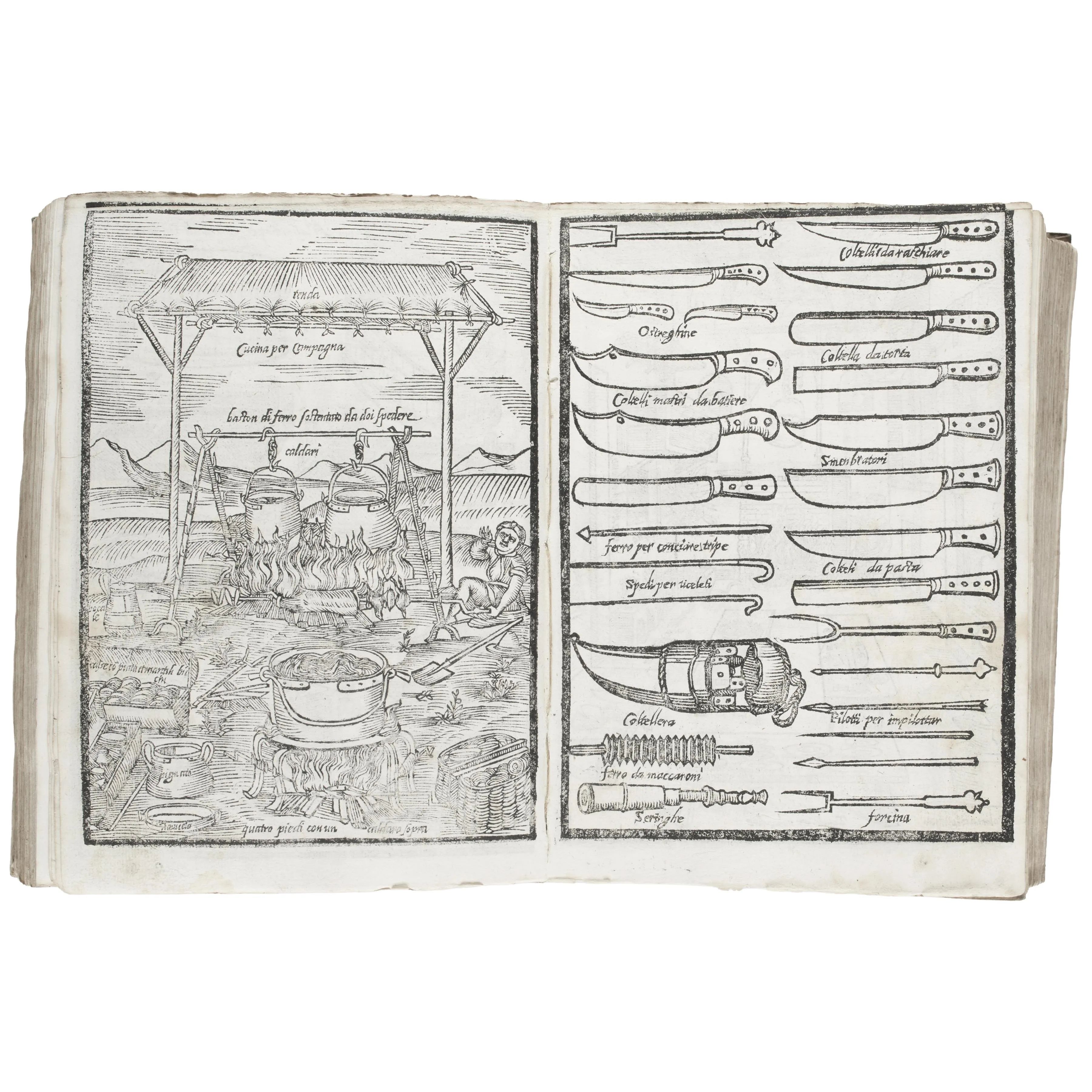 Scappi, Bartolomeo. Opera dell’arte del cucinare, con la quale si può ammaestrare qual si voglia Cuoco, Scalco, Trinciante, o Mastro di Casa: Divisa in sei libri […] con le Figure che fanno di Bisogno nella Cucina. Venezia, de’ Vecchi, 1610. Legato con Cesare Pandini. Il mastro di casa. Venezia, de’ Vecchi, 1610.