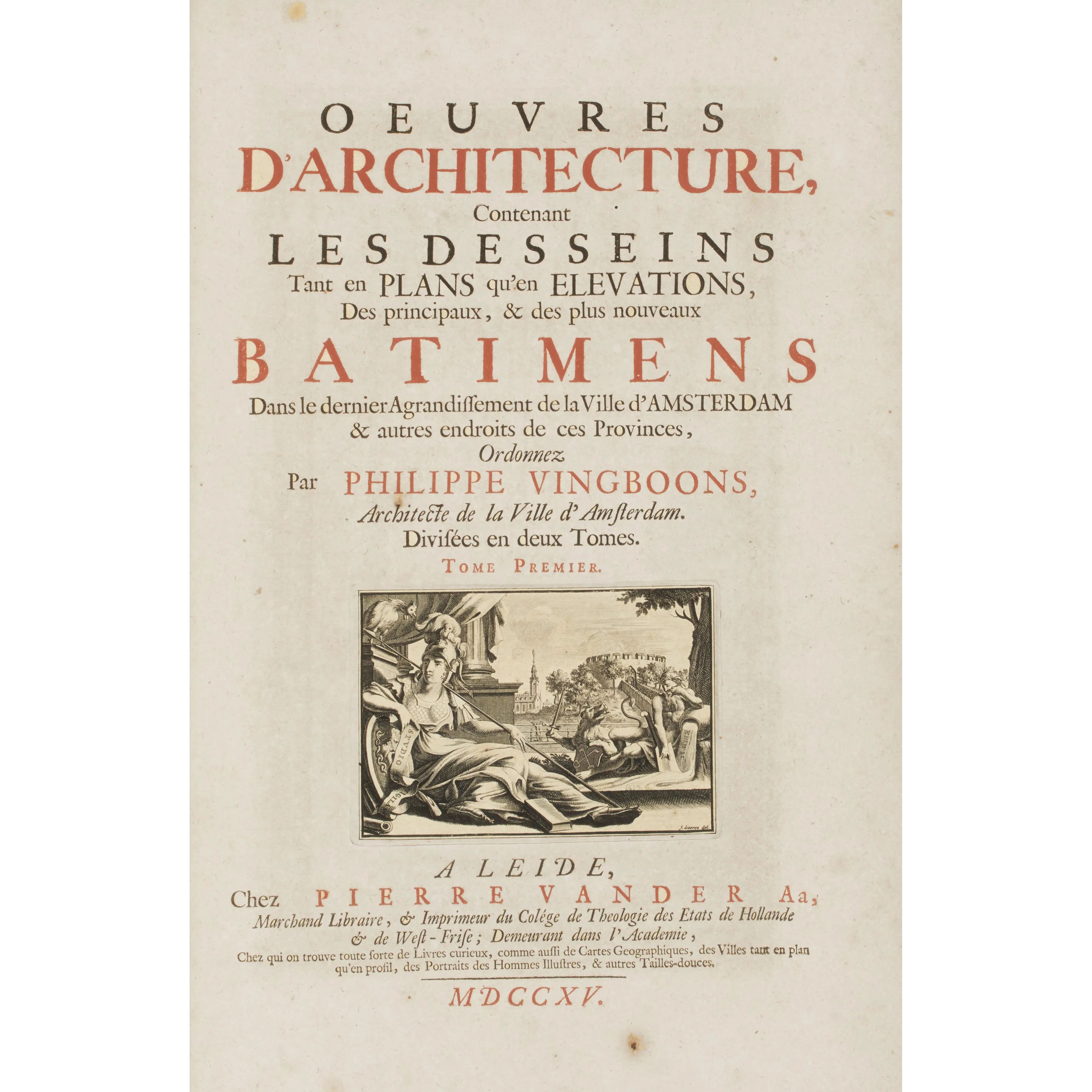 Vingboons,Philippe. Oeuvres d'architecture contenant les desseins tant en plans qu'en élévations des principaux et des plus nouveaux bâtimens dans le dernier agrandissement de la ville d'Amsterdam et autres endroits de ces provinces. Leida, van der Aa, 1715.