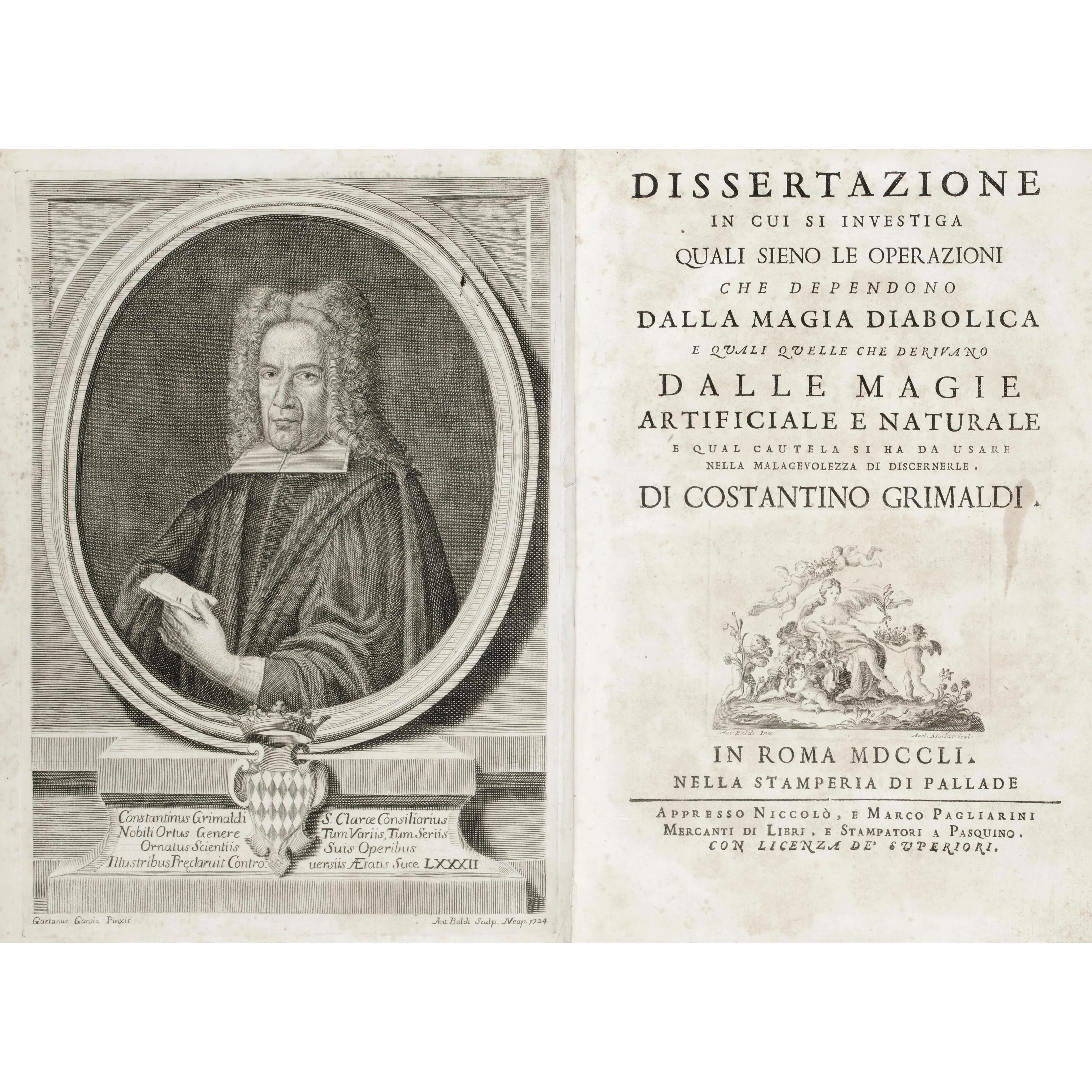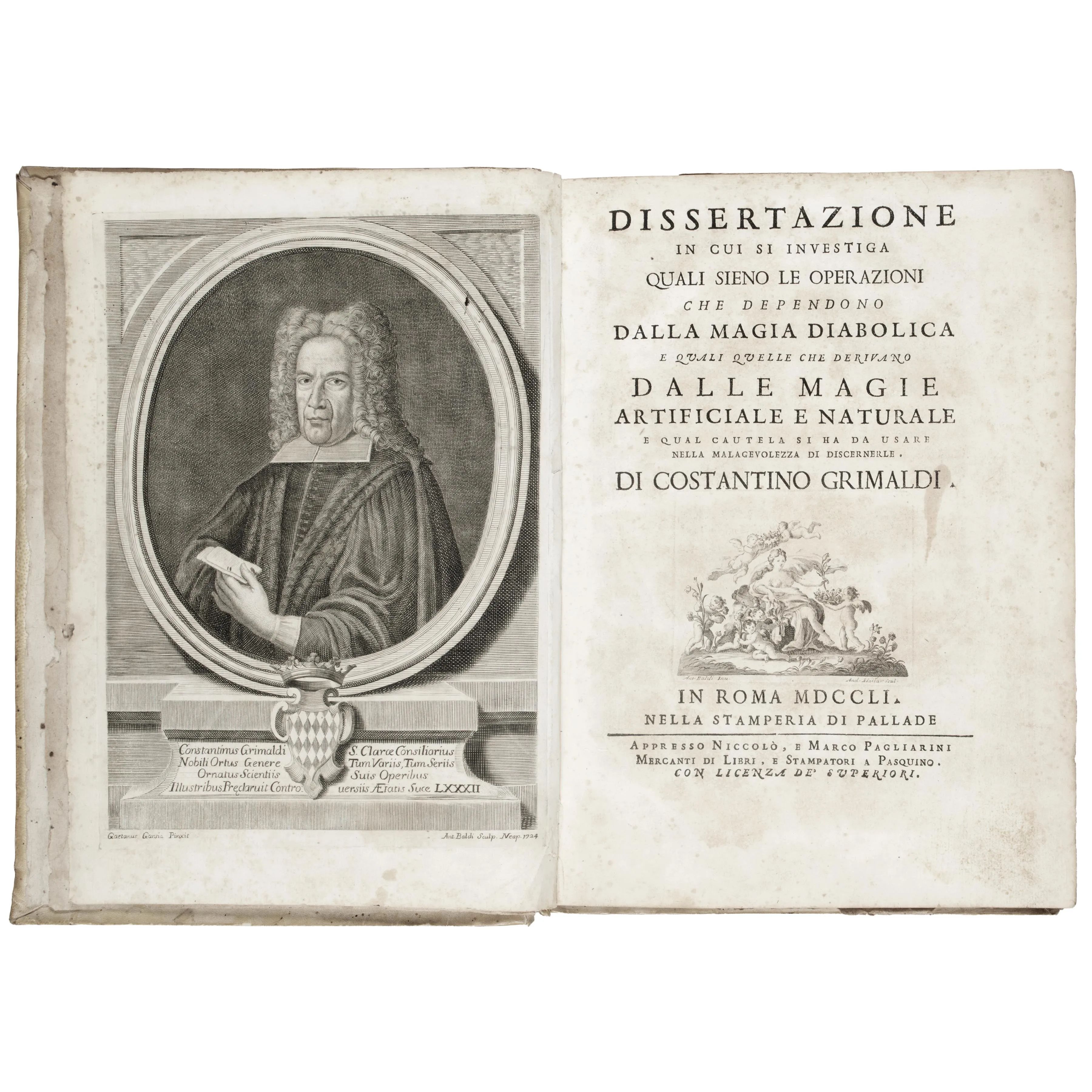 Grimaldi, Costantino. Dissertazione in cui si investiga quali sieno le operazioni che dependono dalla magia diabolica e quali quelle che derivano dalle magie artificiale e naturale. Roma, Pallade, 1751.