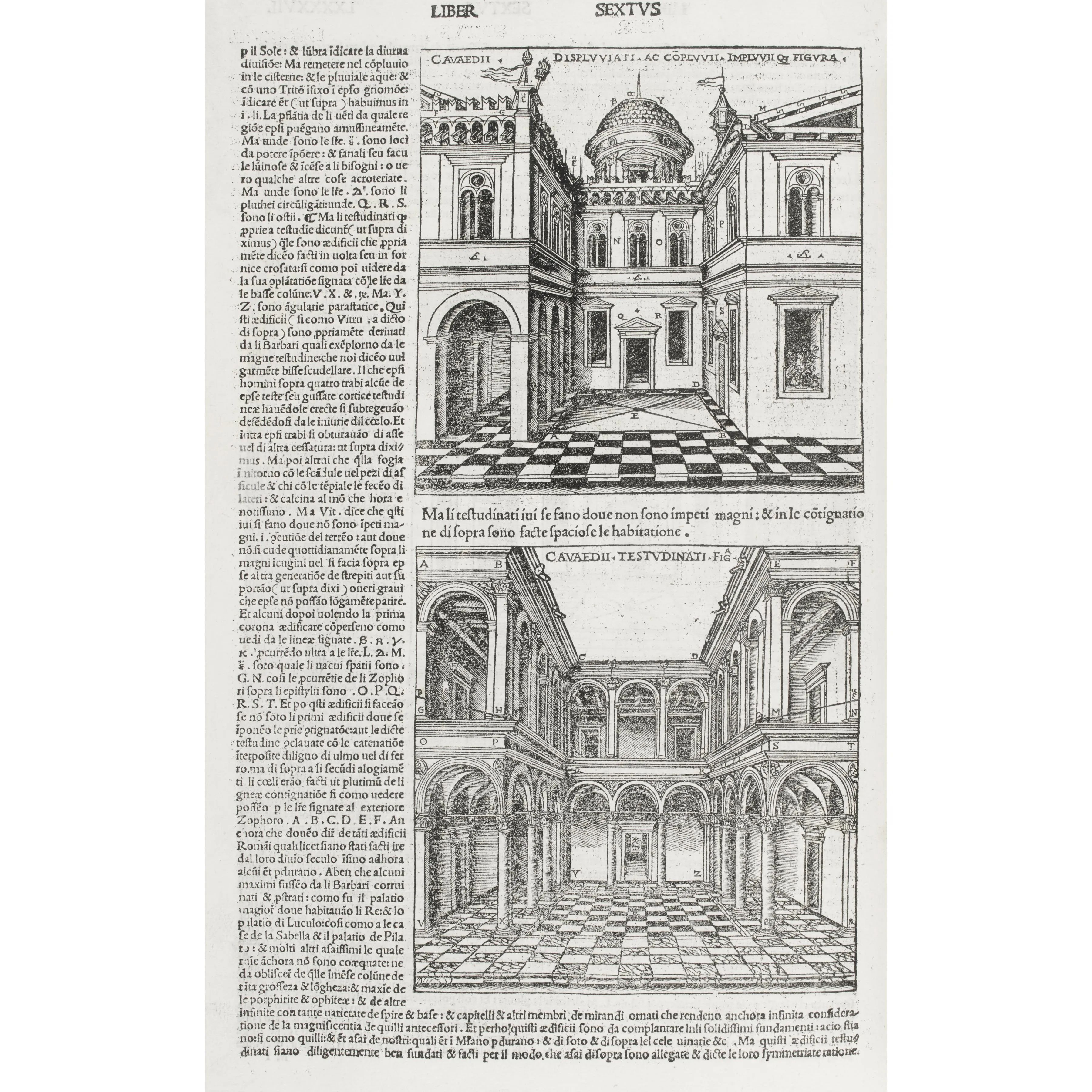 Esemplare di studio, ma completo in tutte le sue parti, del celebre De architectura libri dece, tradotto e commentato da Cesare Cesariano e stampato a Como da Gottardo da Ponte nel 1521. Si tratta della più ricercata tra le edizioni vitruviane antiche, straordinaria per l’apparato iconografico, tradizionalmente avvicinato alla mano di Leonardo da Vinci. Di particolare rilievo sono le tre celebri tavole con piante e prospetti del Duomo di Milano, considerate tra le prime rappresentazioni a stampa dell’architettura gotica, complete di pianta, alzati e dettagli costruttivi. L’opera si distingue inoltre per la ricchezza dei riferimenti alla cultura architettonica lombarda del primo Cinquecento: da Bramante alla descrizione della città di Como, dalla Villa Pliniana alla Biblioteca Viscontea di Pavia, fino a osservazioni di carattere tecnico e scientifico, come quelle sull’orologio e della torre di Venezia e sul fenomeno della camera oscura. Stampata in circa 1.300 esemplari, fu l’unica opera uscita dai torchi di Gottardo da Ponte a Como, nonché il quarto libro impresso nella città, conferendole un rilievo storico e tipografico di primaria importanza.