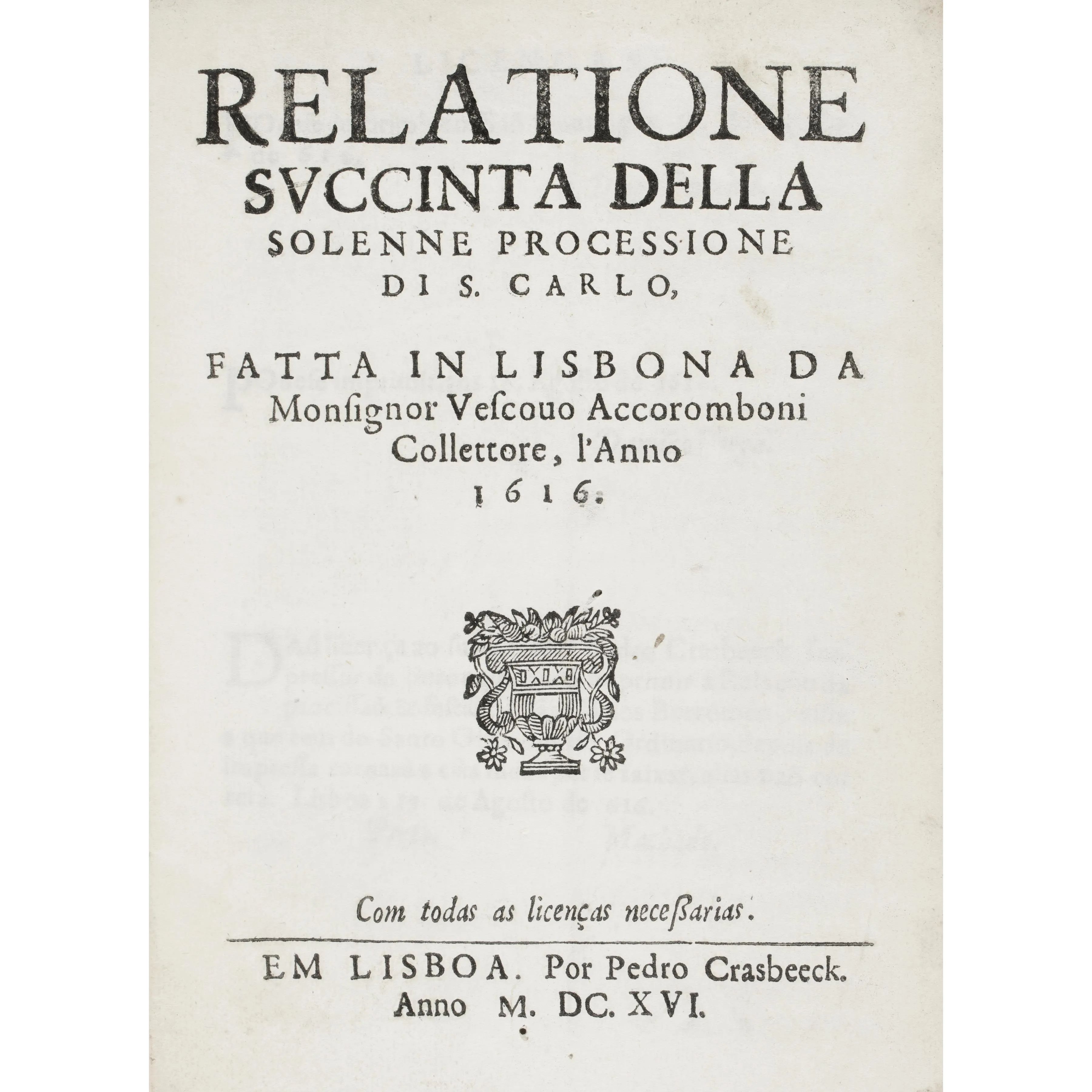 Accoramboni, Ottavio. Relatione succinta della solenne processione di S. Carlo fatta in Lisbona. Lisbona, Crasbeeck, 1616.