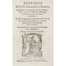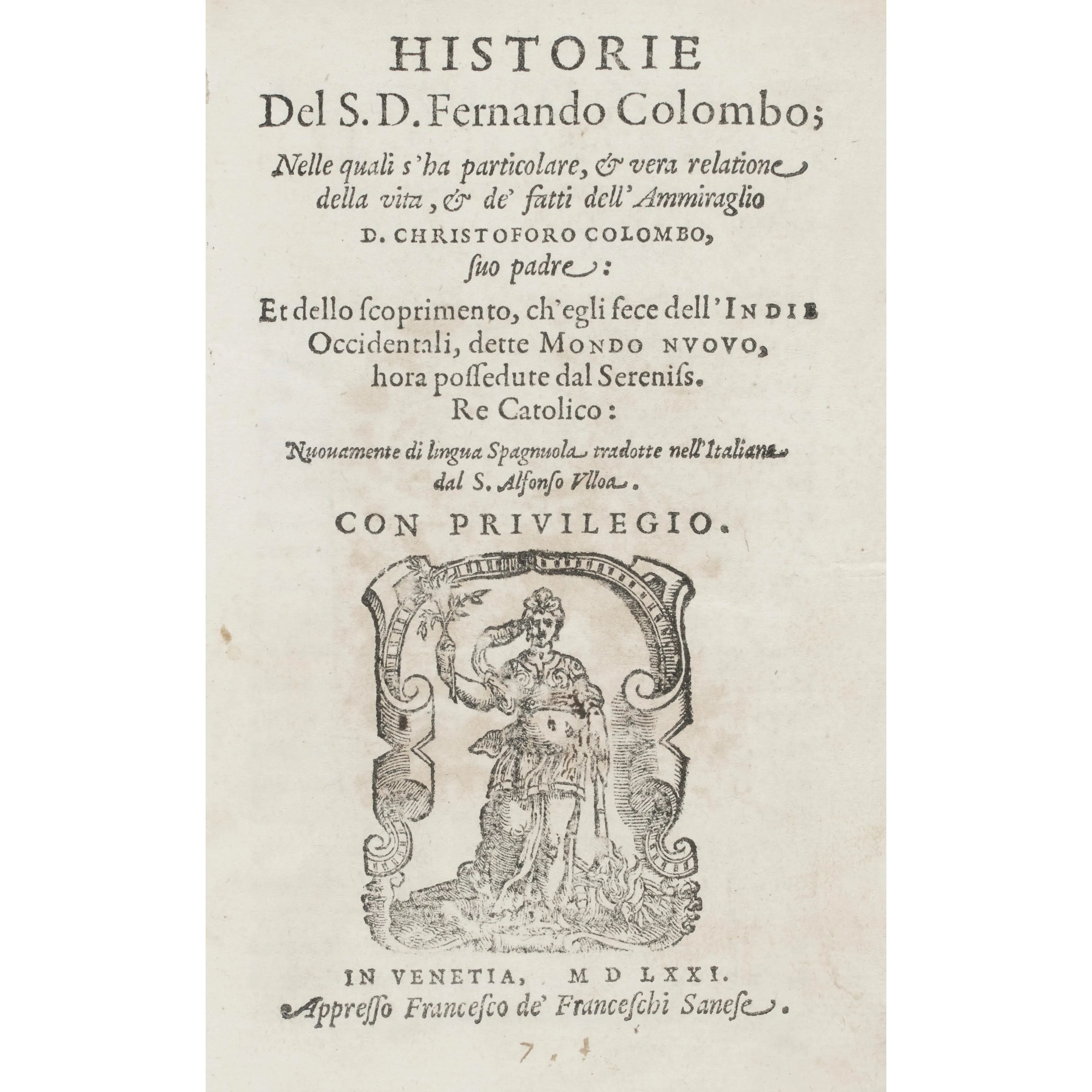 Colombo, Fernando. Historie nelle quali s'ha particolare, e vera relatione della vita, e de’ fatti dell’ammiraglio D. Christoforo Colombo suo padre. Venezia, de’ Franceschi, 1571.